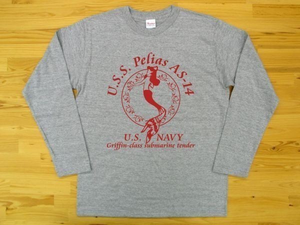 U.S.S. Pelias AS-14 杢グレー 5.6oz 長袖Tシャツ 赤 L ミリタリー 米海軍艦艇 グリフィン級潜水母艦 ペリアス U.S. NAVY 人魚