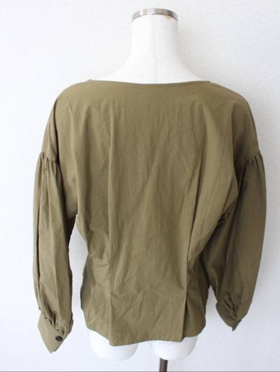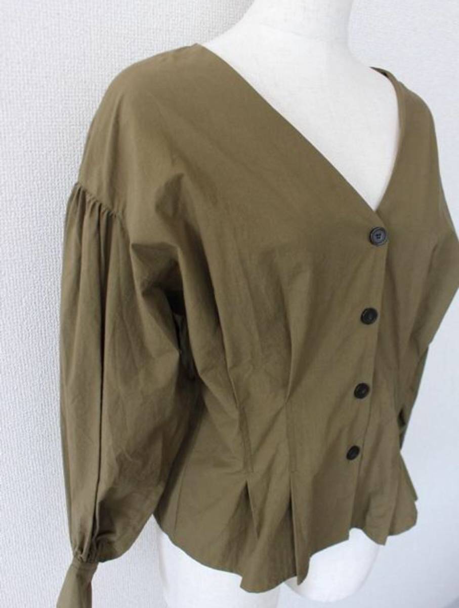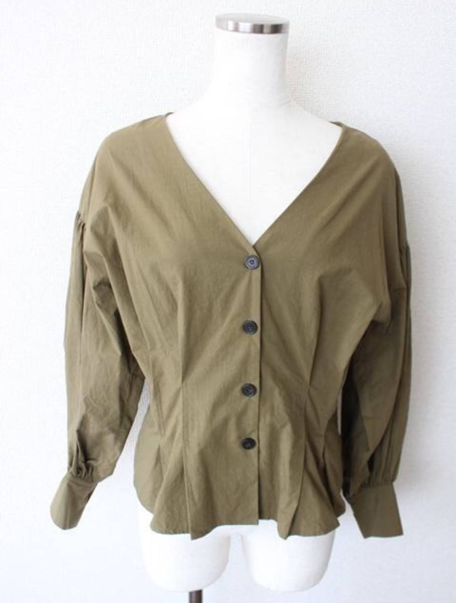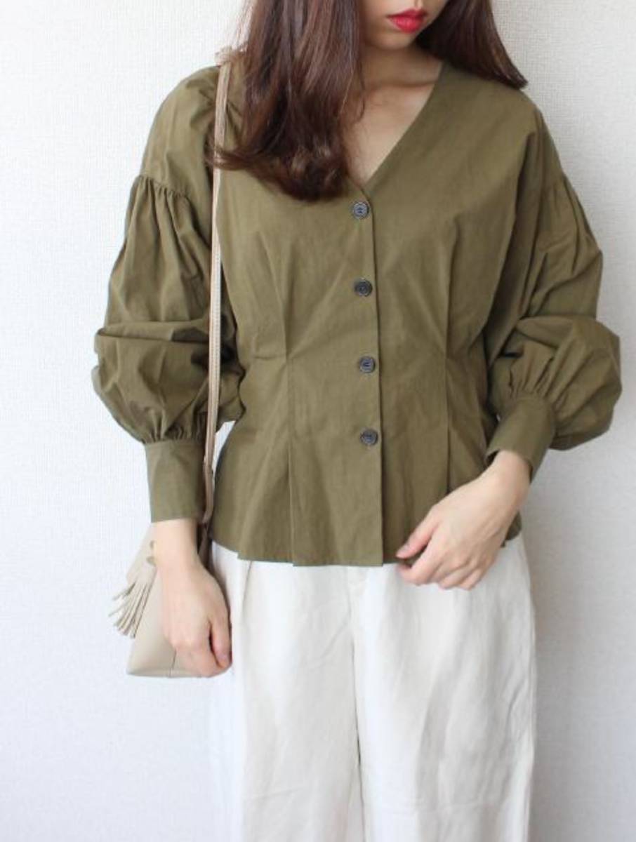 女性らしいVネックに、ウエストを高く見せるタック使い、シャツディテールの前釦にカフス使いと、トレンド要素たっぷりの一枚。