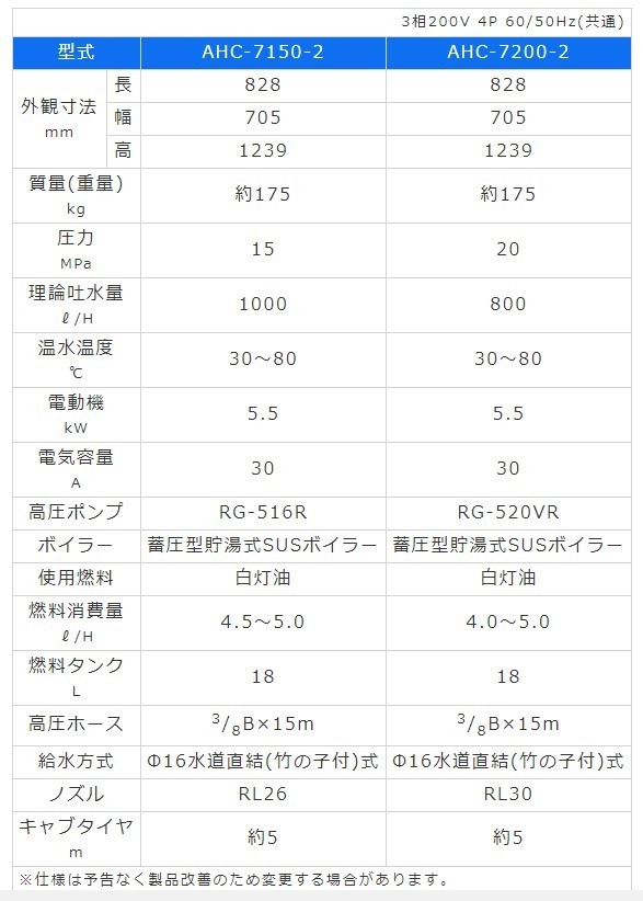 【商品詳細】 【有光 高圧洗浄機 AHC-7150-2 200V高圧温水タイプ】 外観寸法 mm 長 /幅 /高: 828×705×1239 質量(重量) kg:約175 圧力 MPa : 15 理論吐水量 l/h :1000 温水温度 ℃: 30~80 電動機 kW: 5.5 電気容量 A: 30 高圧ポンプ: RG-516R ボイラー :蓄圧型貯湯式SUSボイラー 使用燃料: 白灯油 燃料消費量 l/h: 4.5~5.0 燃料タンク L: 18 高圧ホース: 3/8B×15m 給水方式: Φ16水道直結(竹の子付)式 ノズル: RL26 キャブタイヤ m: 約5 ■写真は、イメージです。 メーカーホームページはこちらから有光工業株式会社 重量物は法人様のみ車上渡し元払いになります。 個人様は、運送会社様の営業所止めになります。 ※仕様は予告なく変更になることがございます。 ※下記注意事項の確認をお願いいたします。