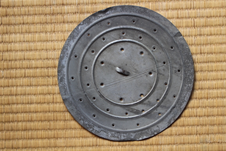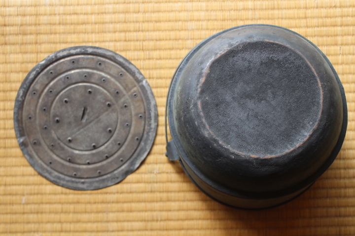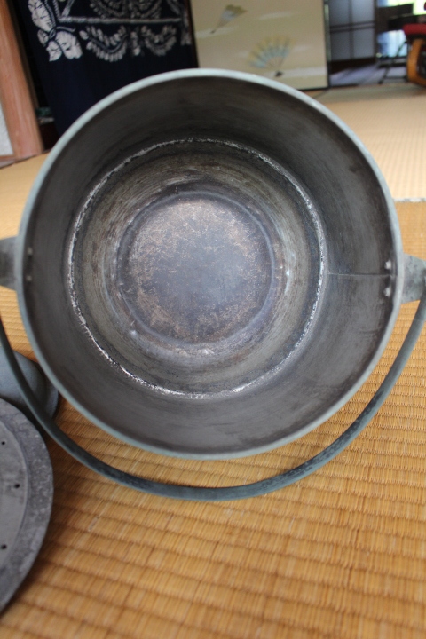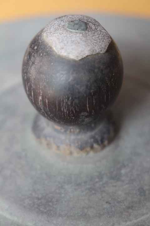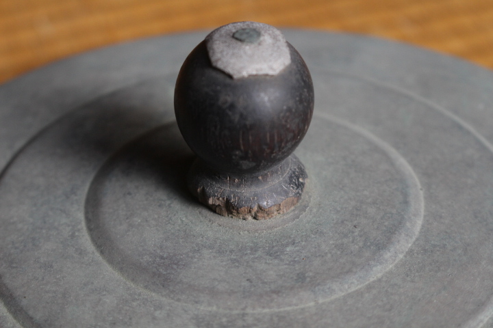 フタのつまみは木製です。欠けがありますがいい味になっています。 フタに凹みがあります。フタはスムーズに開け閉めできます。