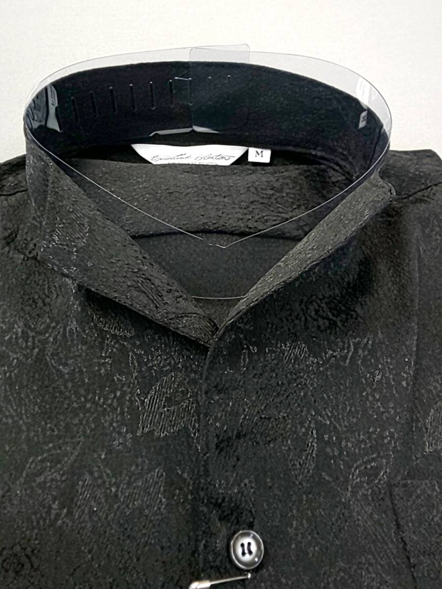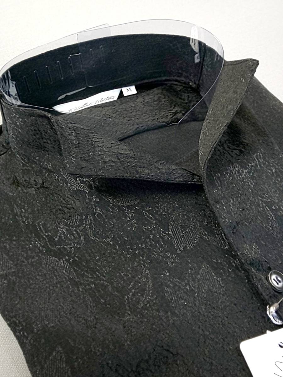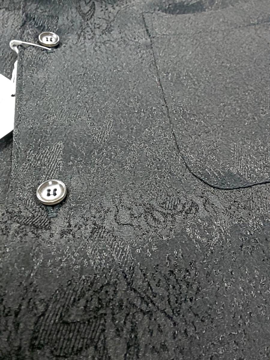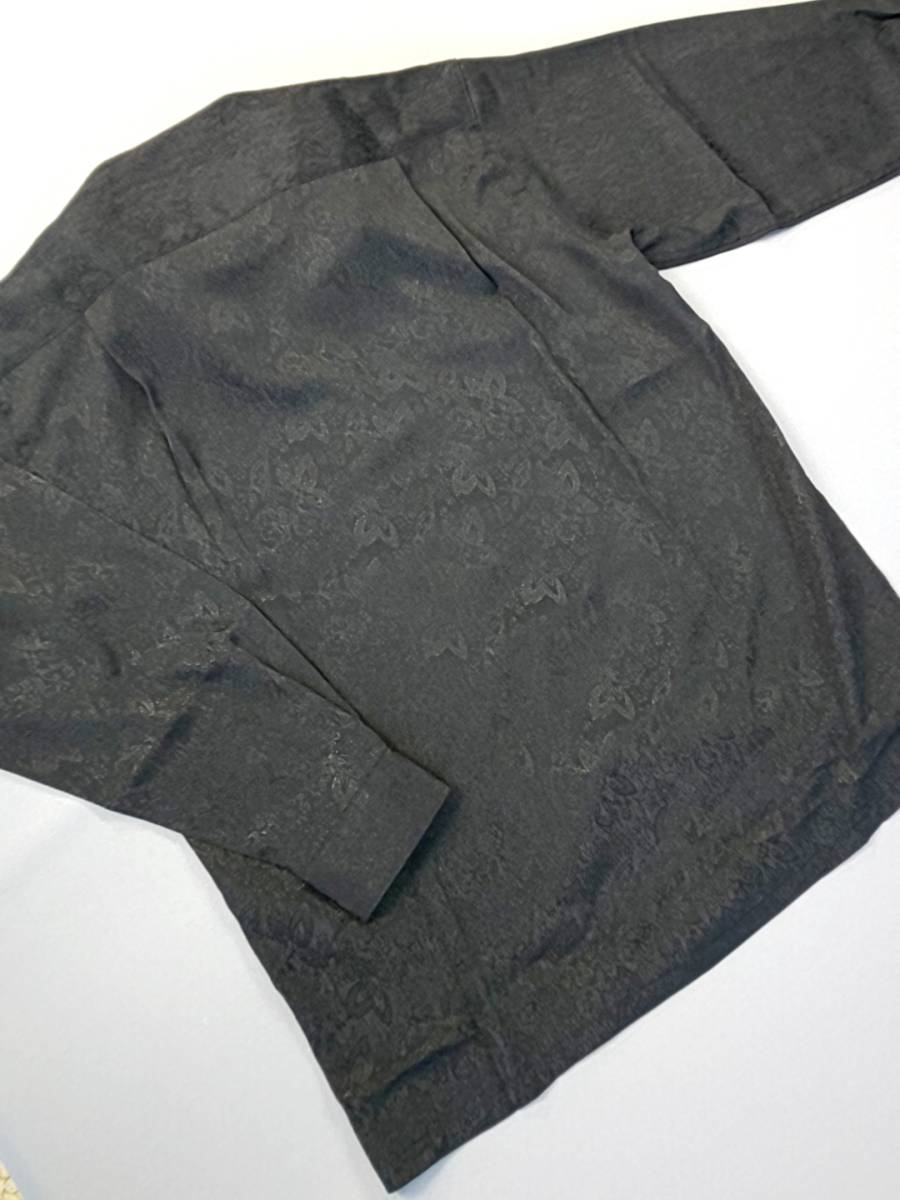 ちりめんの様な黒地に光沢ある黒の花織り柄、変形のスタンド衿など、スタイリッシュな商品です。