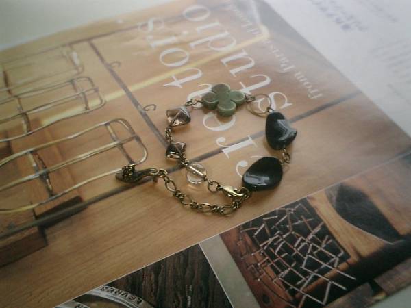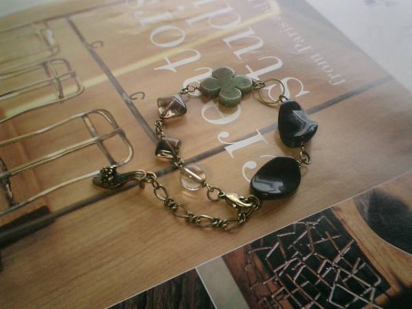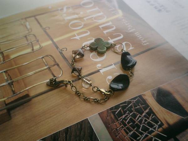 イノセント・ガール・・シリーズです♪四つ葉のクローバーを見つけて・・オニキスとスモーキークォーツのシックなブレスレットです♪オニキスは13ミリ×18ミリ位のツイストオーバルです♪10ミリ、12ミリのスクエアや8ミリの丸玉などデザイン違い、大きさ違いのスモーキークォーツを合わせて大人の表情です♪四つ葉のクローバーのような20ミリのグリーンオパールを合わせて可憐にロマンチックしています♪長さは23センチ位で調節自由です♪♪お揃いのネックレスも出品しています♪♪お揃いのシリーズも出品しています♪シンプルで長く着けていただけるデザインを考えて作りました♪ハンドメイドをご理解頂いてノークレーム、ノーリターンでお願いします