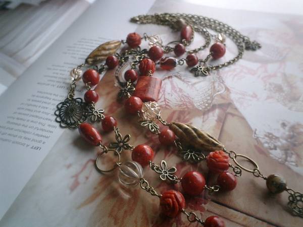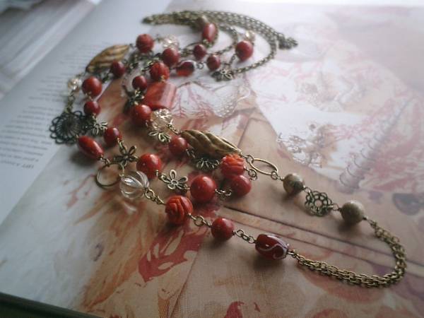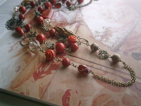 異国に旅して・・シリーズです♪シルクロードへの道・・オリエンタルモダンな表情のネックレス2本セットです♪シックな大人色の赤のネックレスのデザイン違いです♪重ねてネックレスに1本をブレスレットにといろいろに楽しんでいただけます♪長い方のネックレスは8ミリ、10ミリの丸玉、10ミリの薔薇、18×8ミリ位のナツメ、20×15ミリのスクエアなどの赤のスポンジ珊瑚に8ミリの丸玉、30×10ミリのライン入りナツメなどのピクチャージャスパー、透かしチャーム、デザイン樹脂ビーズ、ナツメ型のボーンを合わせてひっそりロマンチックしています♪長さは全長95センチ位で調節できます♪2連にされても素敵です♪短い方のネックレスは8ミリ、10ミリの丸玉のスポンジ珊瑚に11ミリのお花のチャームを合わせて可憐な表情です♪長さは全長61センチ位で調節自由です♪チョーカー風にされたりブレスにされても素敵です♪それぞれ単品やお揃いのブレスレットやピアスも出品しています♪シンプルで飽きのこないいつまでも着けられるデザインを考えて作りました!ハンドメイドをご理解頂いてノークレーム、ノーリターンでお願いします