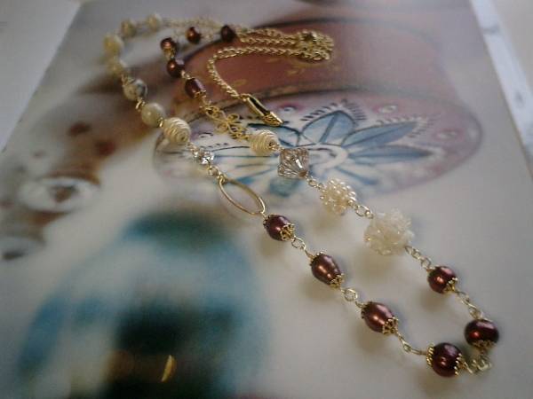 パリの屋根裏部屋シリーズです♪クラシカルなジュエリーに憧れて・・!キュートな素材を集めてひたすらシックにまとめました♪アフリカンオパールは8ミリ、10ミリの丸玉、ダークレッドの淡水パールは8ミリから9ミリ位のポテト、淡水パール玉やジルコニアリングや樹脂薔薇やサテンボールやデザインチャームを合わせてひっそり華やかな表情です♪長さは全長85センチ位で調節自由です♪2連にしても可愛いです♪パリの屋根裏部屋をイメージして作りました♪シンプルで飽きのこないいつまでも着けられるデザインを考えて作りました!お揃いのブレスレットも出品しています♪ハンドメイドをご理解頂いてノークレーム、ノーリターンでお願いします