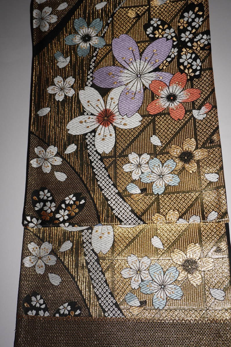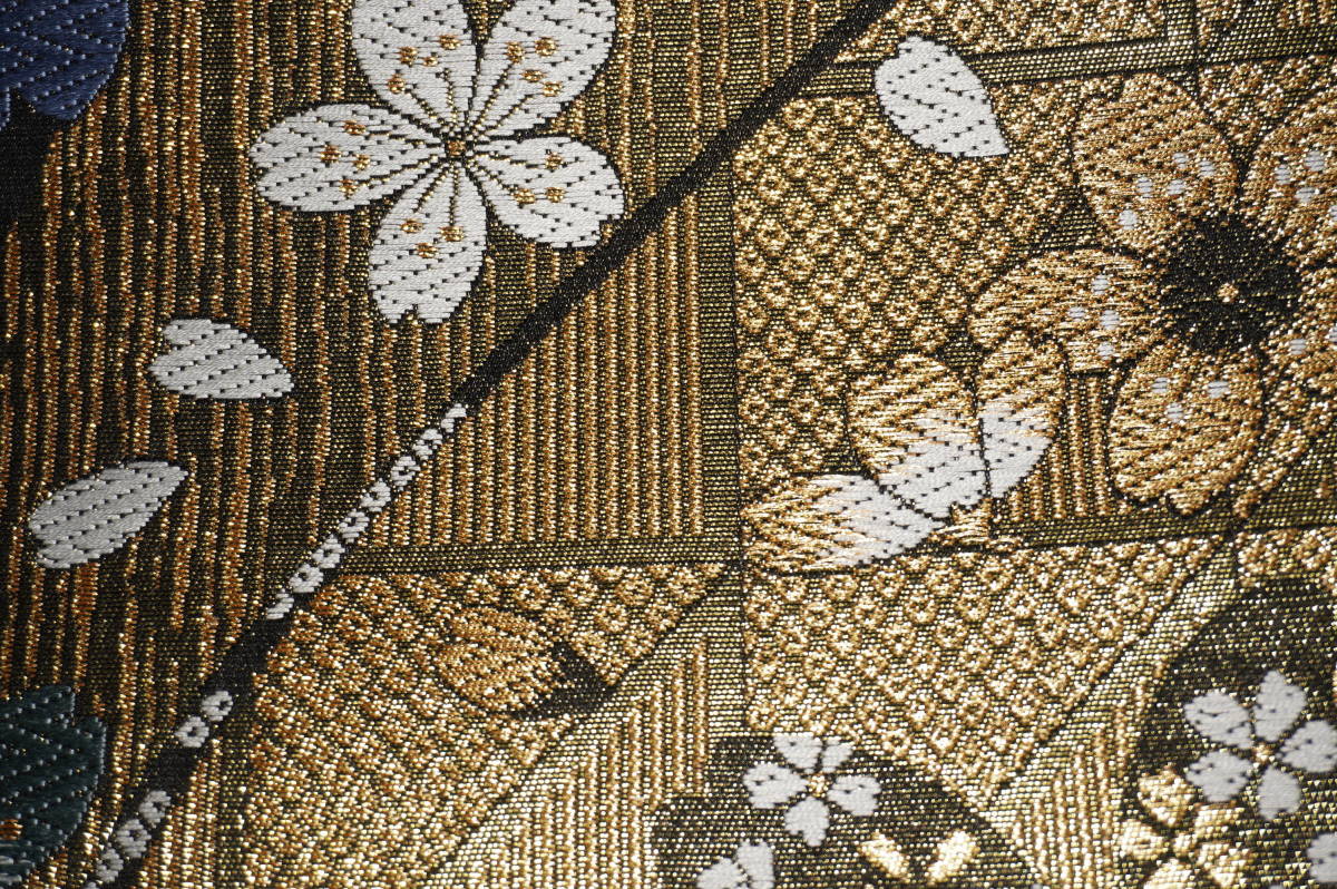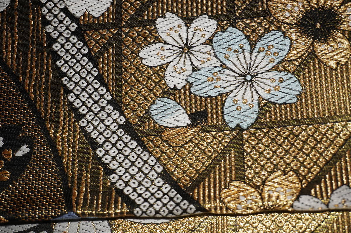 なお、帯柄左上に無地で出ているところは裏無地で、柄と柄の間に出ているところは手先と前太鼓のあいだの無地部分です。六通柄です。金銀糸が多用されているためストロボの照りで、しろぽく写っている部分があります