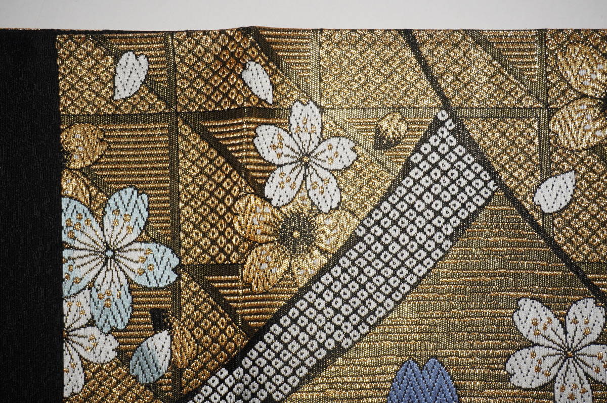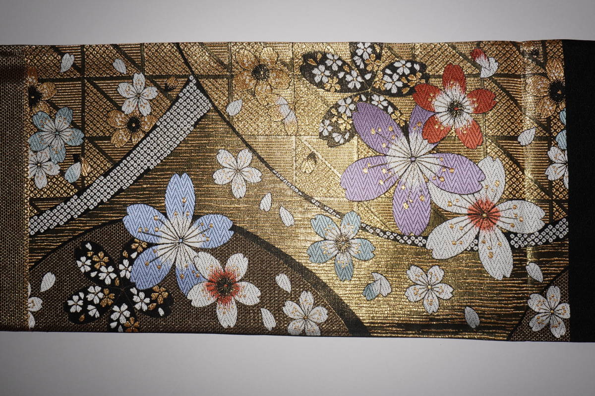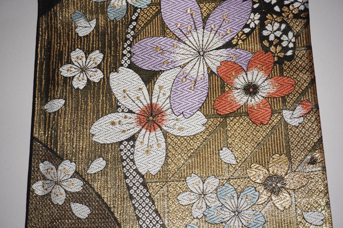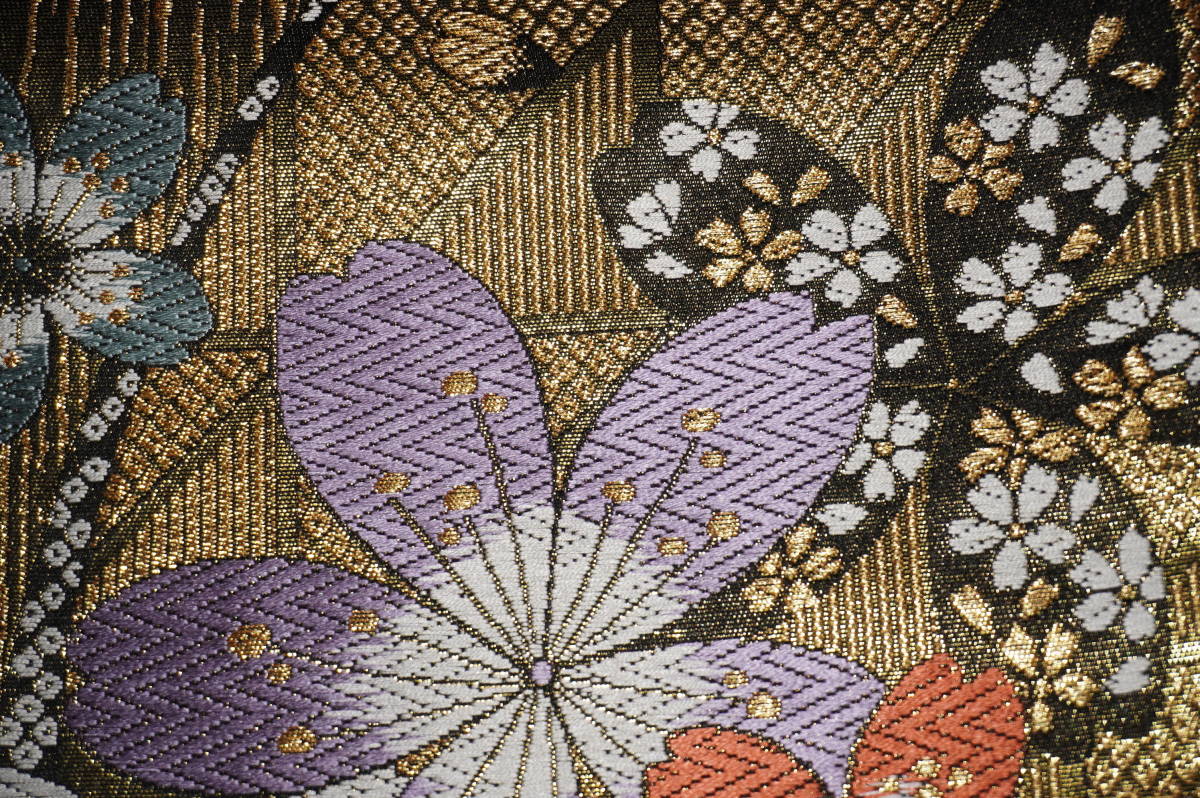 なお、帯柄左上に無地で出ているところは裏無地で、柄と柄の間に出ているところは手先と前太鼓のあいだの無地部分です。六通柄です。金銀糸が多用されているためストロボの照りで、しろぽく写っている部分があります
