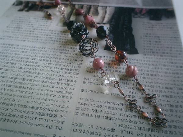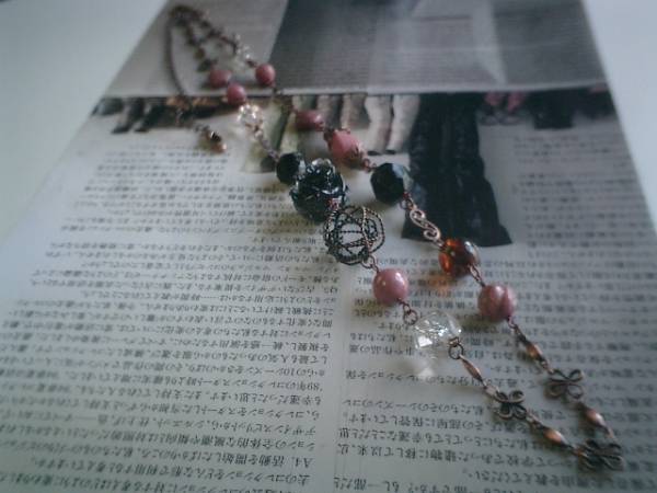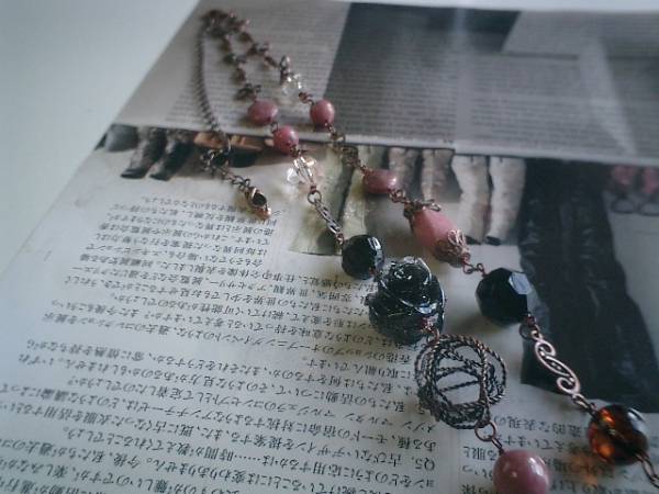 ニューヨークスタイル♪シリーズです!ベーシックでさりげなく遊び心をいれたデザインです♪モーヴ色の秋をまとって・・ロマンチックなネックレスです♪デザイン違い、大きさ違いのシックなモーヴピンクのロードナイトを集めた可憐なネックレスです♪ロードナイトは8ミリ、10ミリの丸玉や10ミリのSラインや座金でおめかしした17×8ミリ位のツイストや10ミリのコインです。15ミリ位のワイヤーボールや樹脂薔薇やデザインビーズや琥珀色の樹脂ビーズをお花のチェーンでまとめてアンティークモダンな表情です♪モーヴピンクやブラックやブラウンの大人色でまとめているので色々なお洋服に合わせて楽しんで頂けると思います♪長さは全長74センチ位で調節自由です♪2連にしてチョーカー風にしても可愛いです♪シンプルで長く着けて頂けるデザインを考えて作りました♪お揃いのブレスレットも出品しています。ハンドメイドをご理解頂いてノークレーム、ノーリターンでお願いします
