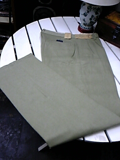 PC環境にもよると思いますが、画像ではグレーぽい色になっておりますが、もっと明るいグリーン系のうぐいす色です。素材は 綿 100% です。ウエスト 実測 72cm (表示 73cm ) 裾幅 21,5cm 腿幅(股下 10cmの所) 30cmと ワイドシルエットのテーパードパンツです。 前股上 28cm です。勿論 新品ですので、ご希望どおりの長さ等で裾上げして、着用して頂けます。 そして、御希望により 裾上げ修理等も 実費にて承ります。 尚 毎週木曜日は業務定休日で御座います。ご連絡御発送とも休業日明けにずれ込む事 ご了承下さい。よろしくお願い申し上げます。