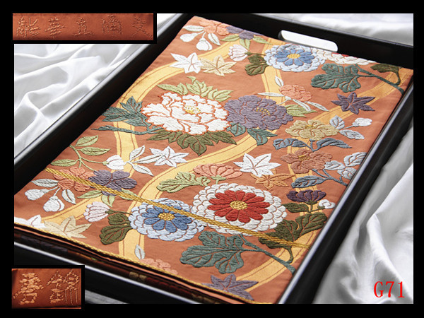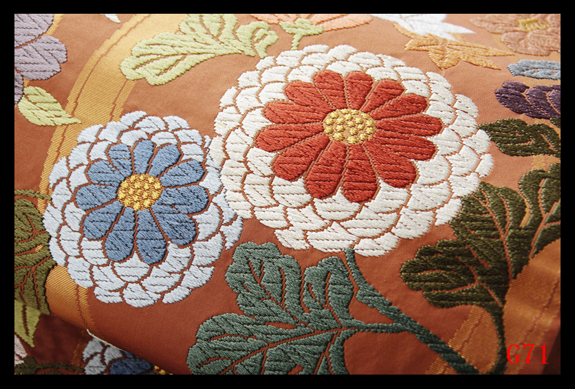 綾織地の上に、さらに多彩な色糸を使い、柄を刺繍のように立体的縫い取りで織り出す技法でした豪華絢爛な織物のことで。錦地の中で最も高級とされる織物です