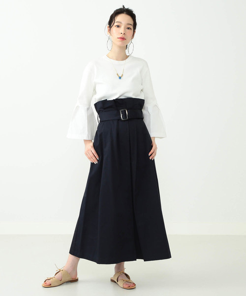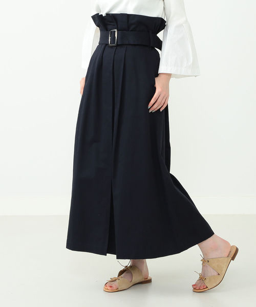 チノ素材を使用したきちんと感のあるマキシスカートです。 ラップ風のディテールやAラインのシルエットでかなりボリュームがあります。ウエストはフリルの幅を広くし、太いベルトをつけたデザインでトップスインのコーデにおすすめです。