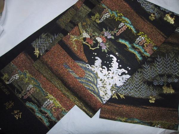 墨地に緑系や暗色でラメ(裏地は黒)かいきり(たれ先柄立ち上がり)~かいきり(手先柄はし)まで約436,5cmですので、出来上がり予想は約433cmです。巾30,6cm2348