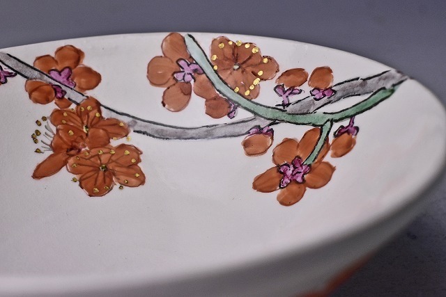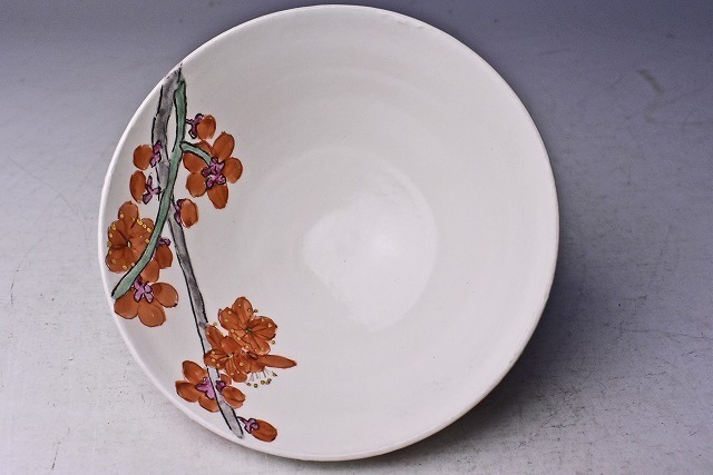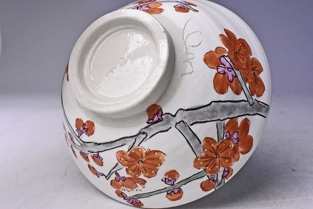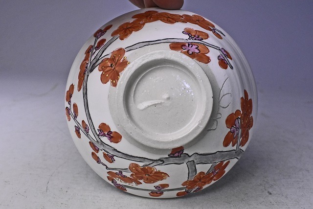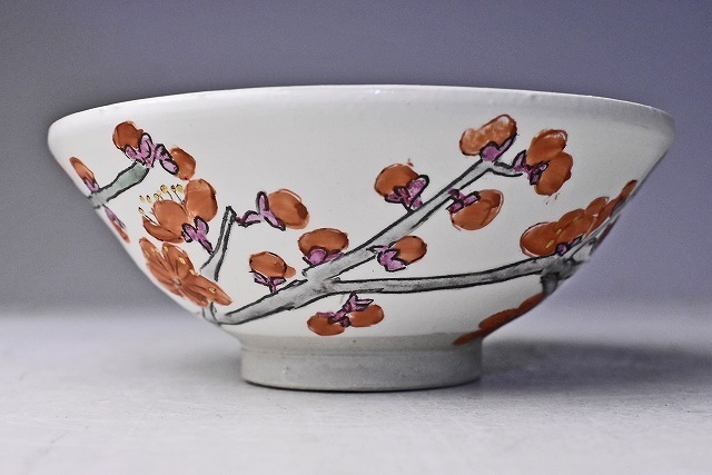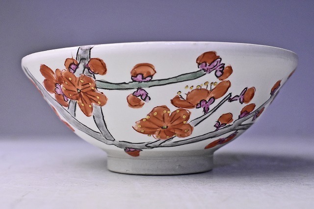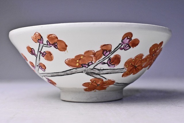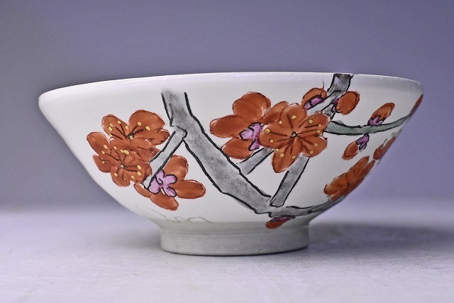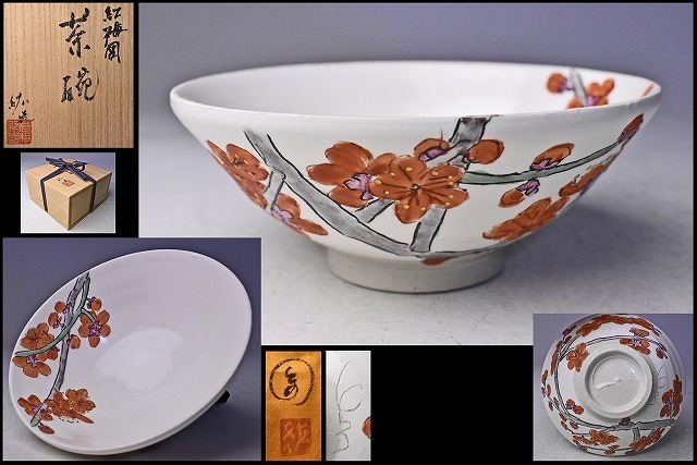 高橋紘 ★ 色絵紅梅図茶碗 ★ 共箱 共布 ★ 見事で雅な絵付の逸品 ★ 茶道具 ★