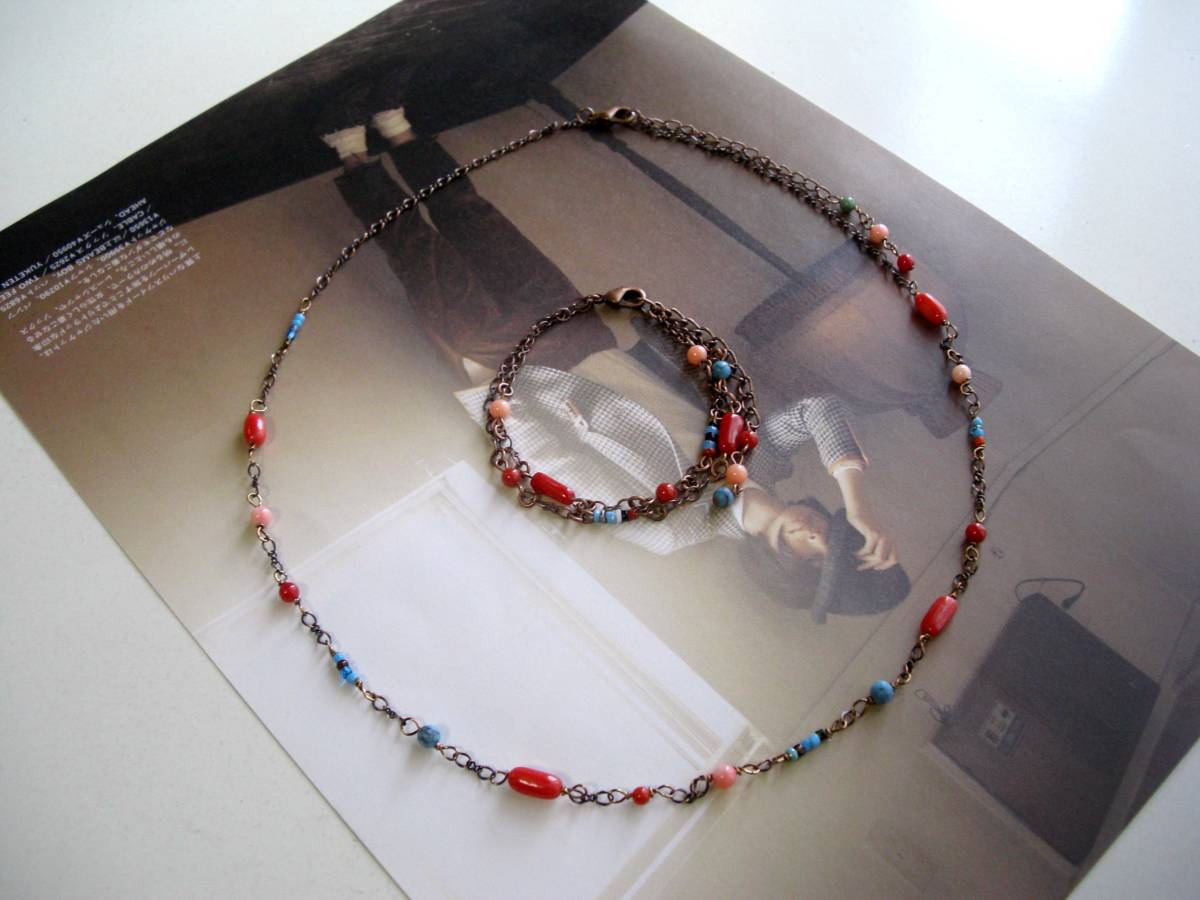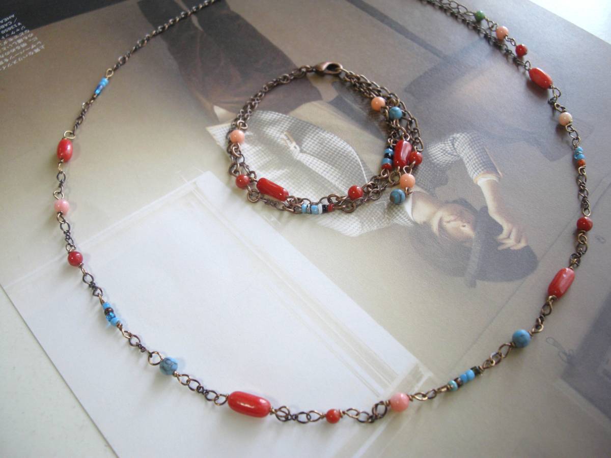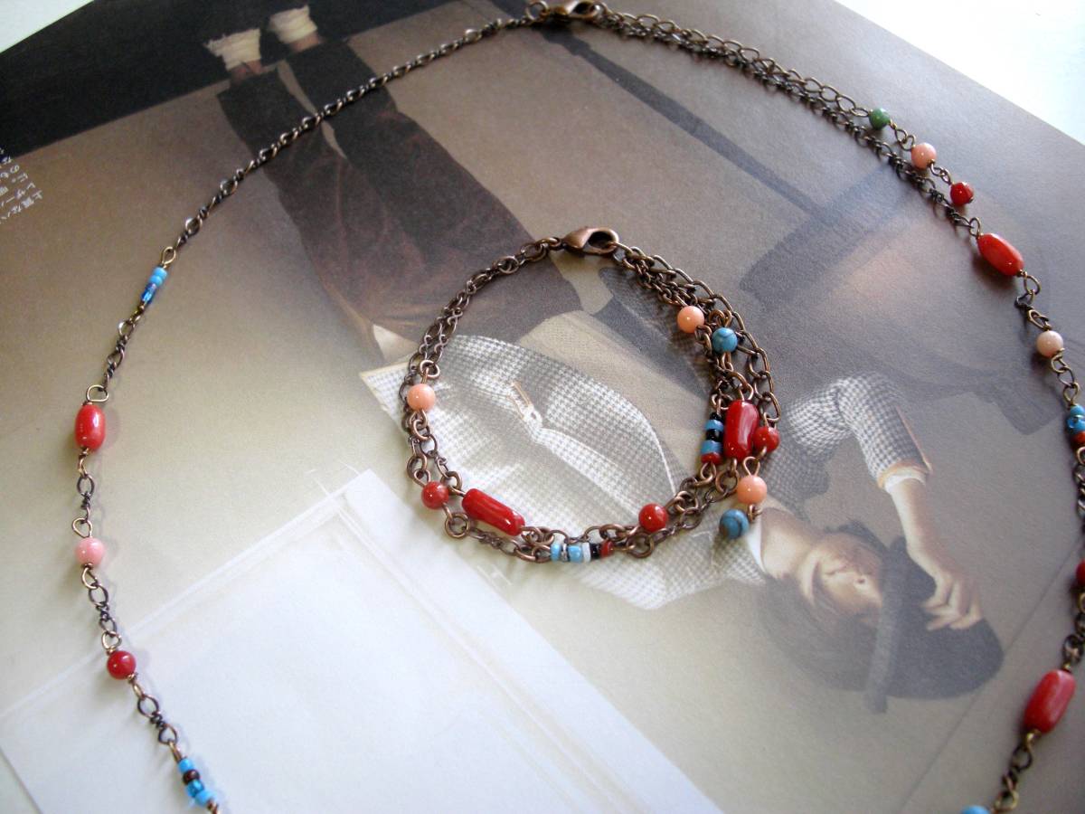 恋する気持ち・・シリーズです♪キュートな色の魔法・・シックな赤珊瑚とターコイズとアンティークビーズのネックレスとブレスレットの2点セットです♪5ミリ位の赤サンゴ、ピンク珊瑚と赤 珊瑚のチューブと4ミリ位のターコイズといろいろなお色のアンティークビーズをつないで楽しい雰囲気です♪ネックレスの長さは50センチ+アジャスター10センチで最長60センチ位です♪ブレスレットは2連で17センチ+アジャスター6センチで最長23センチ位です。それぞれ長さの変更可能です♪シンプルなデザインで長く着けていただけると思います♪ハンドメイドをご理解頂いてノークレーム、ノーリターンでお願いします