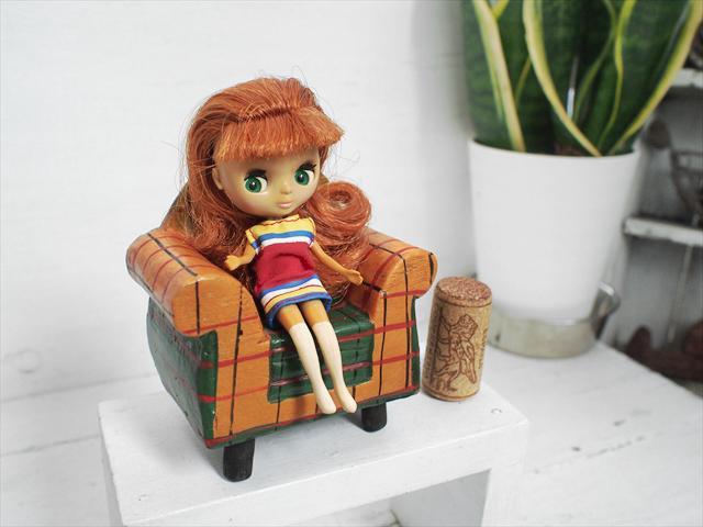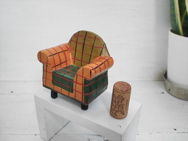 ☆アジア輸入雑貨・プチブライスなどに・木彫り・チェック一人掛けソファー☆人形用椅子飾りディスプレイ☆