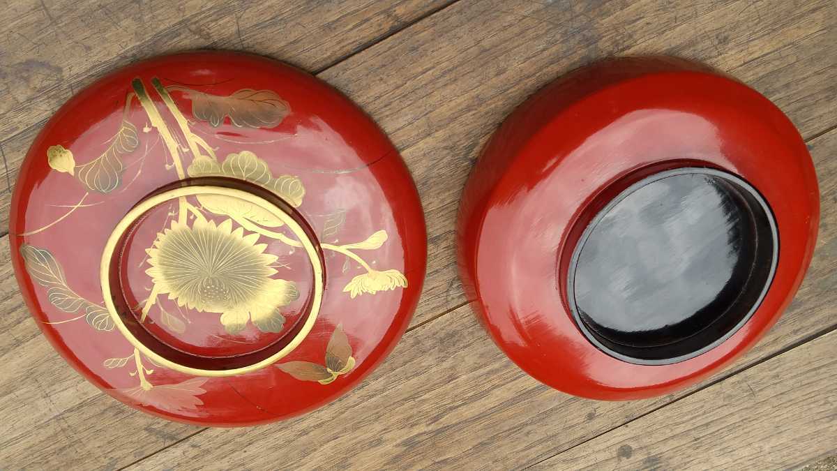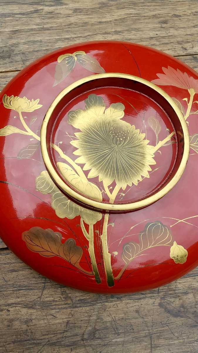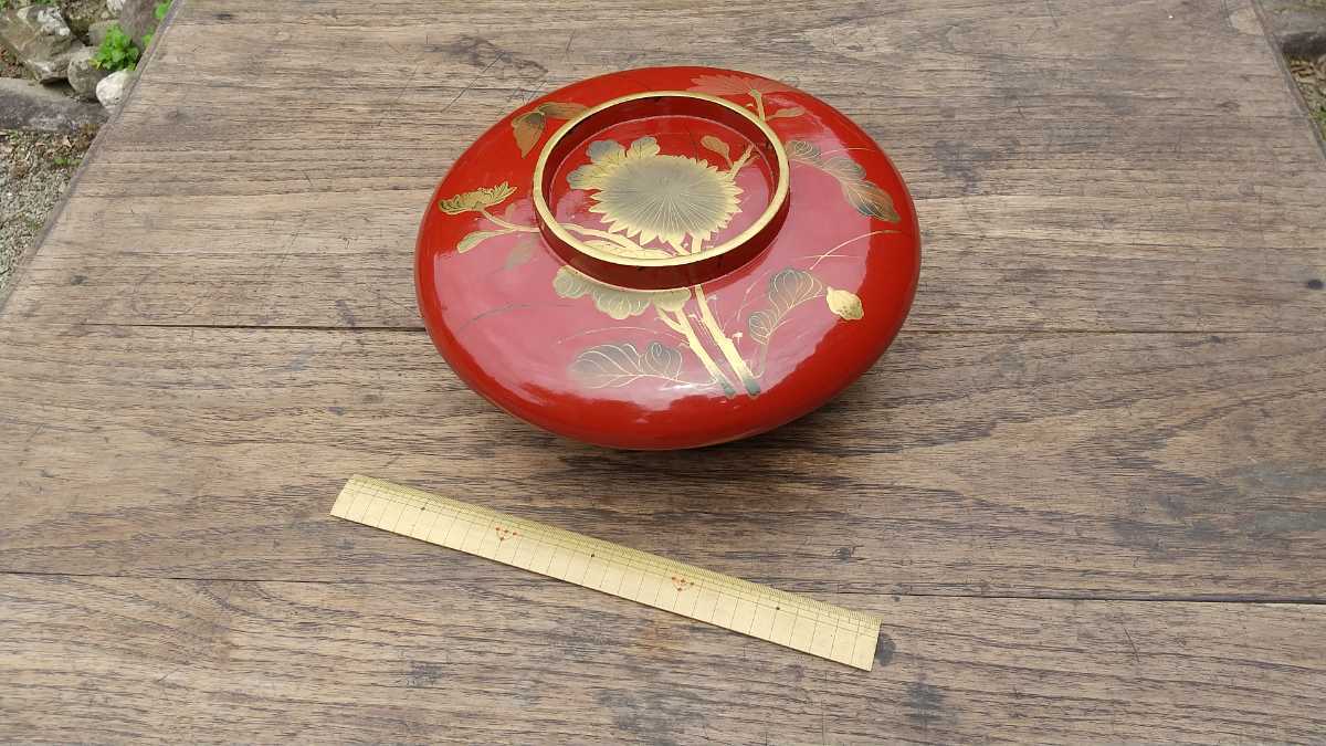 | 菊蒔絵 大平 【直径28㌢高さ12㌢重さ950㌘】 菊と蝶の吉祥紋様 | |||