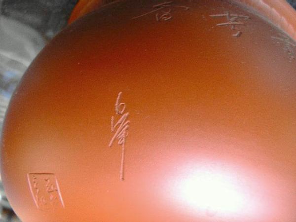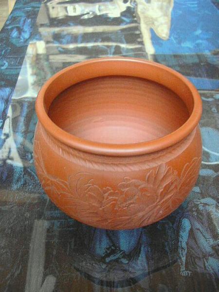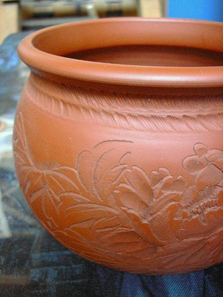 美しく大胆な牡丹の彫りが施された…朱泥の壺!