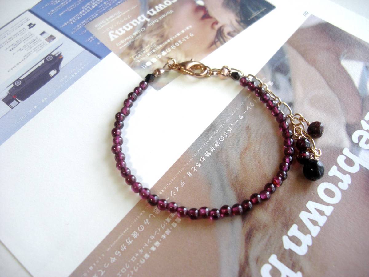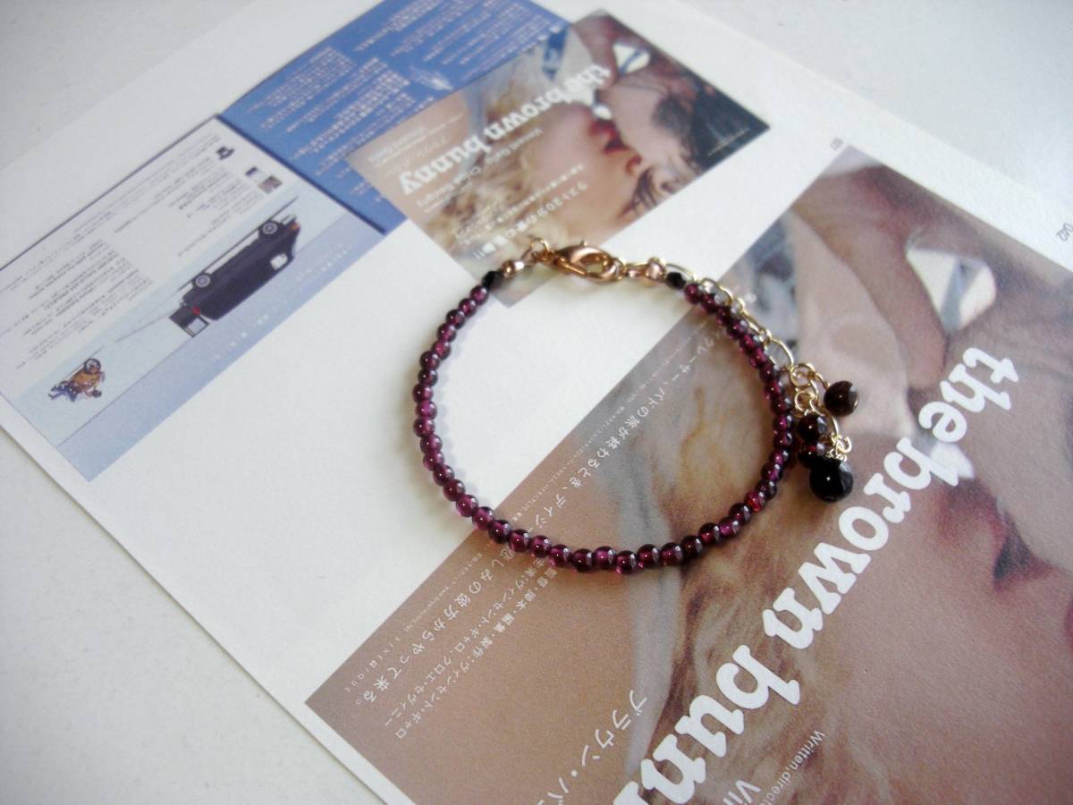 お揃いコーデ・・シリーズです♪ガーネット見本帖・・深い赤のガーネットのブレスレットです♪小粒の丸玉のガーネットにピンクゴールドのチェーンを合わせて可憐な表情です♪3ミリ位の丸玉のガーネットは16センチ+アジャスター6センチで全長22センチ位 です♪ネックレス、イヤリングも出 品しています♪♪シンプルで飽きのこないいつまでも着けられるデザインを考えて作りました!ハン ドメイドをご理解頂いてノークレーム、ノーリター ンでお願いします