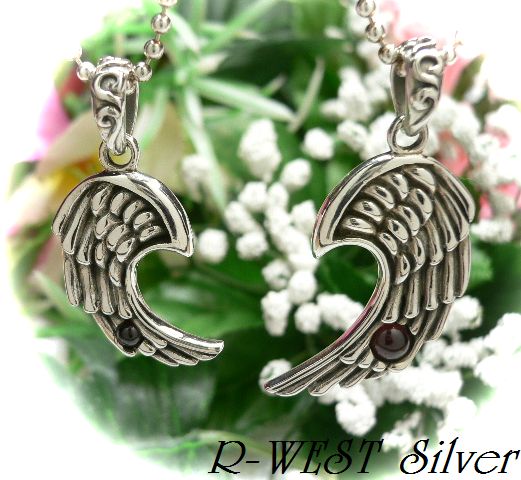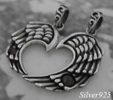 シルバー925銀の天然石ガーネット付フェザー ハート ペア ペンダントset