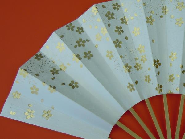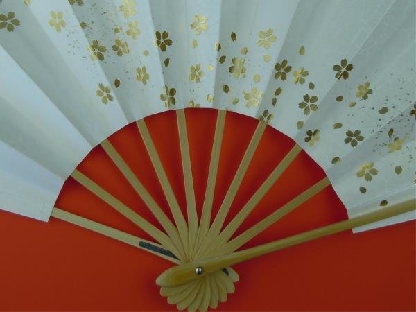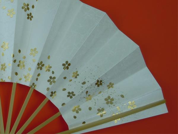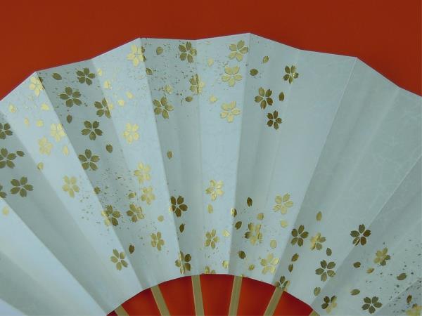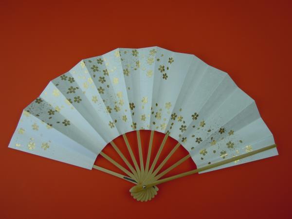 7009,舞扇子 日本舞踊 踊り用 1526 金の桜柄 パールモミ地 白竹骨 京扇子 箱なし