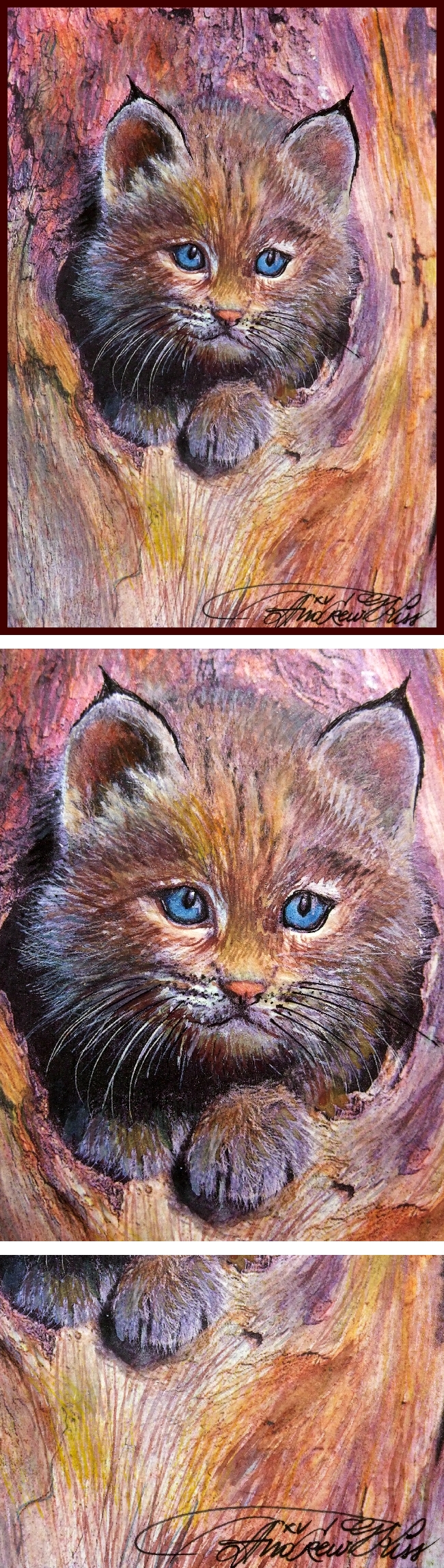 | 非常に美しい水彩画 「巣穴から覗くボブキャットの子」 | |