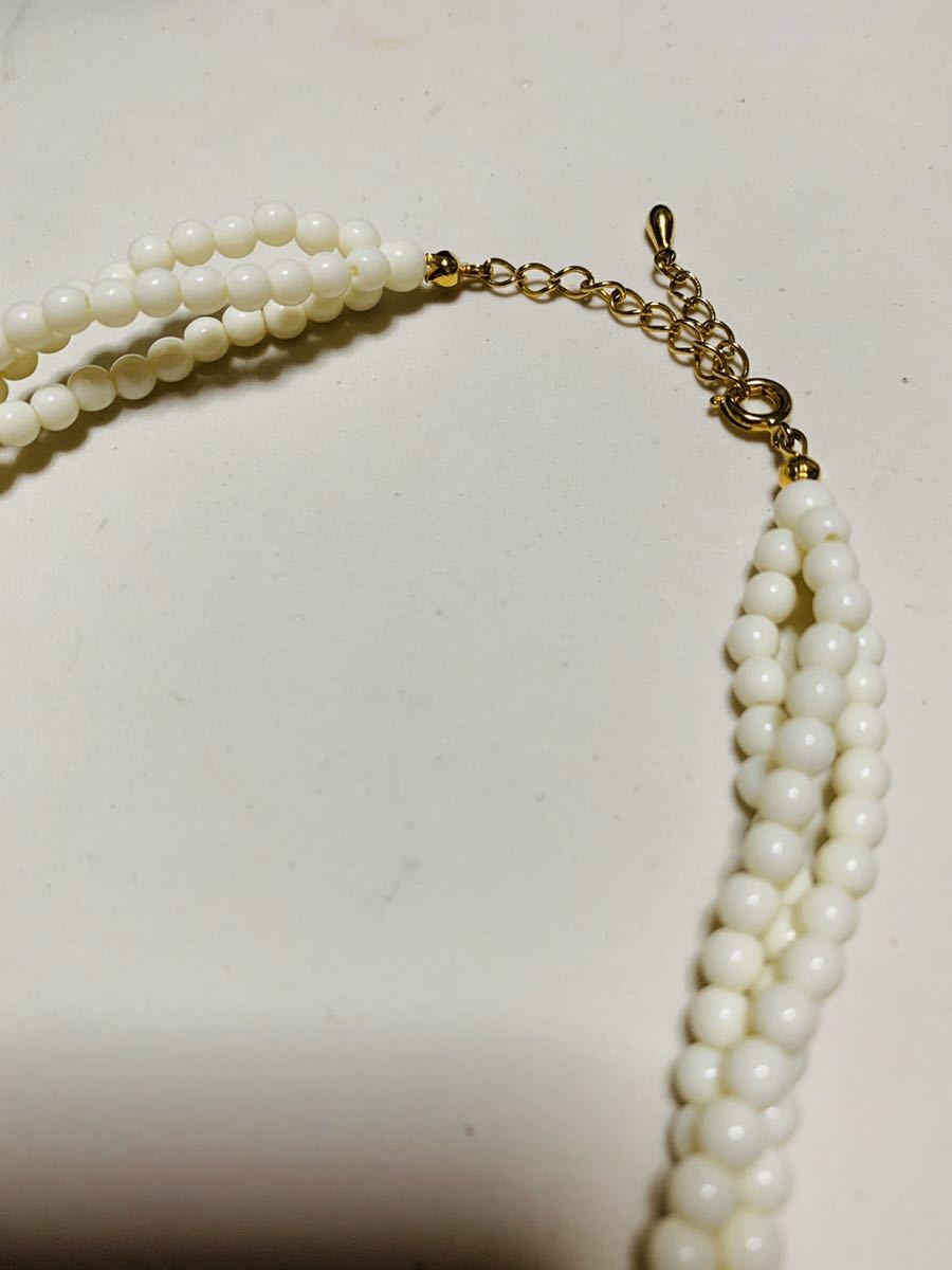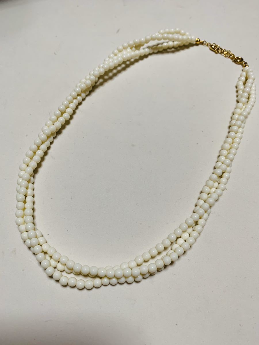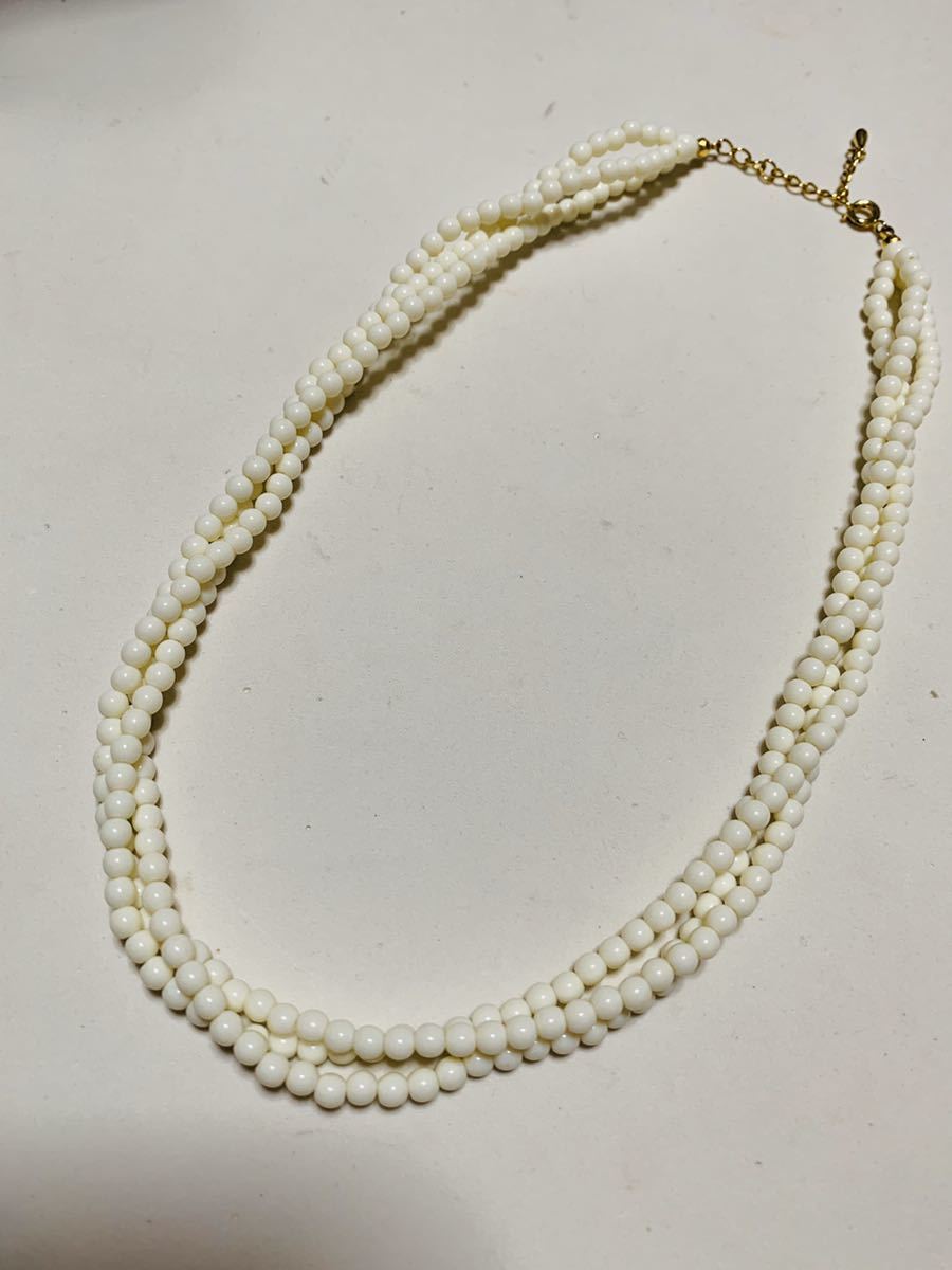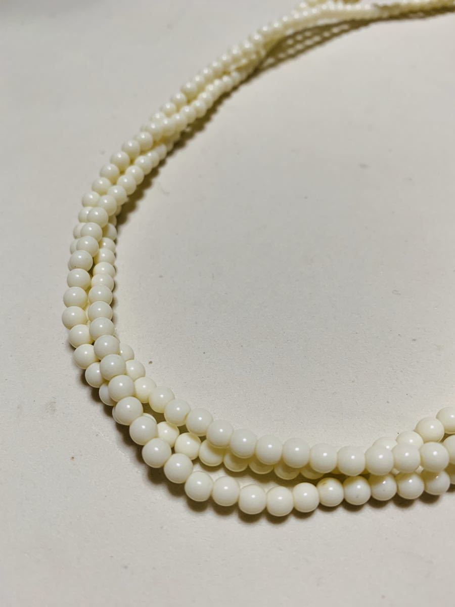 樹脂製、フェイクパール風3連ネックレスです、ひと玉のサイズは直径4ミリ、ネックレスの長さは42センチです