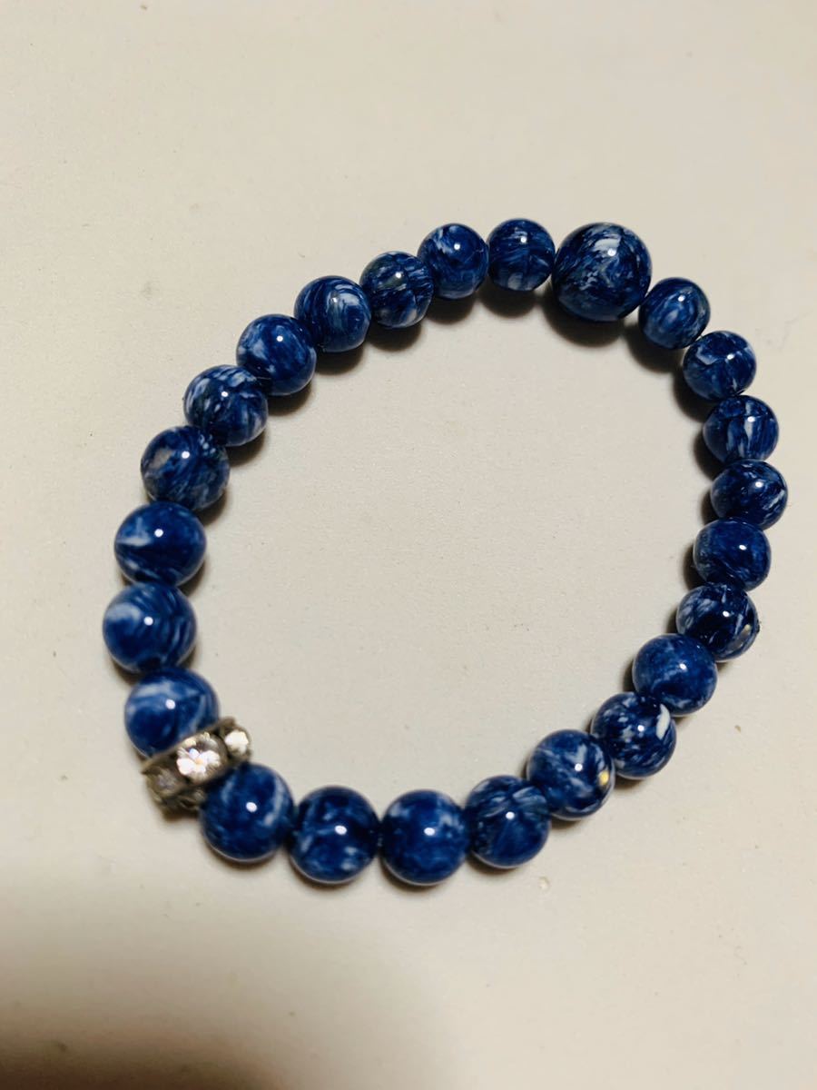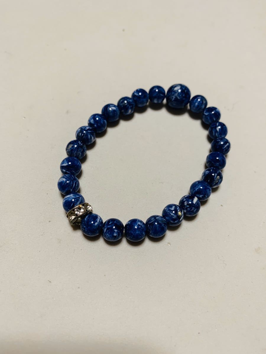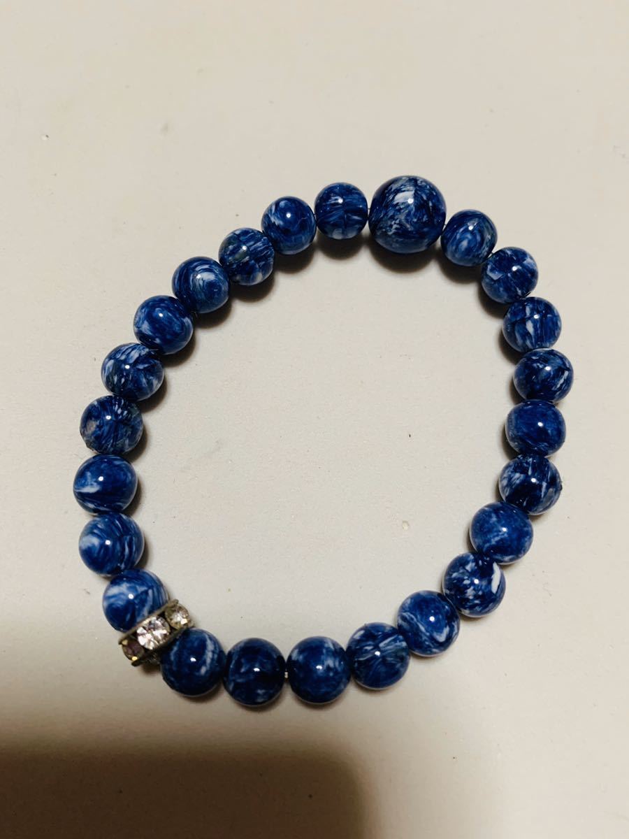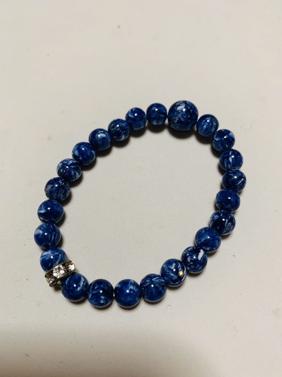 樹脂製のブルーカラーブレスレッドです、ひと玉のサイズは直径6ミリ、おおきな玉は直径10ミリです