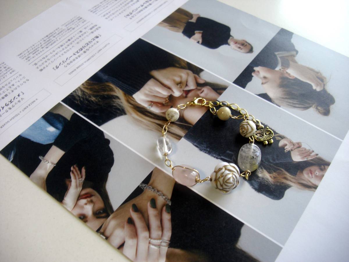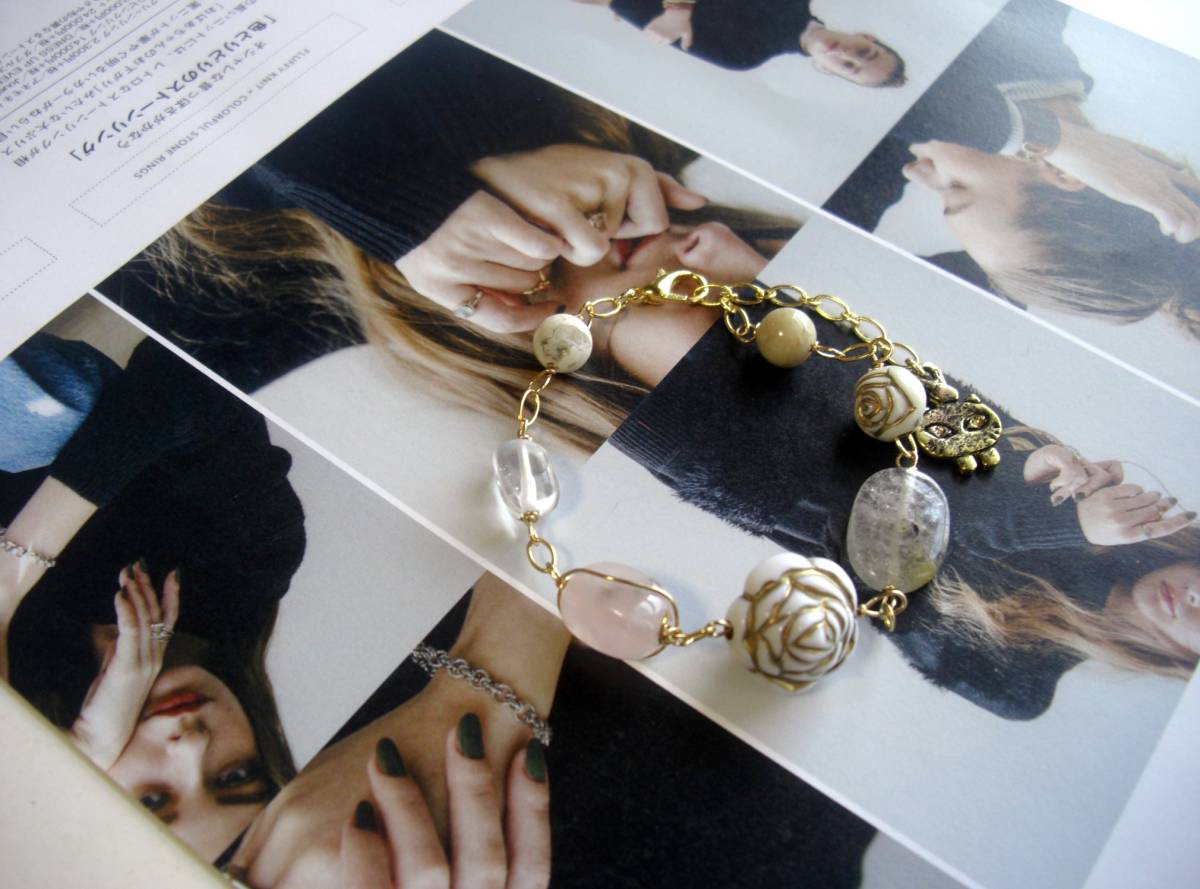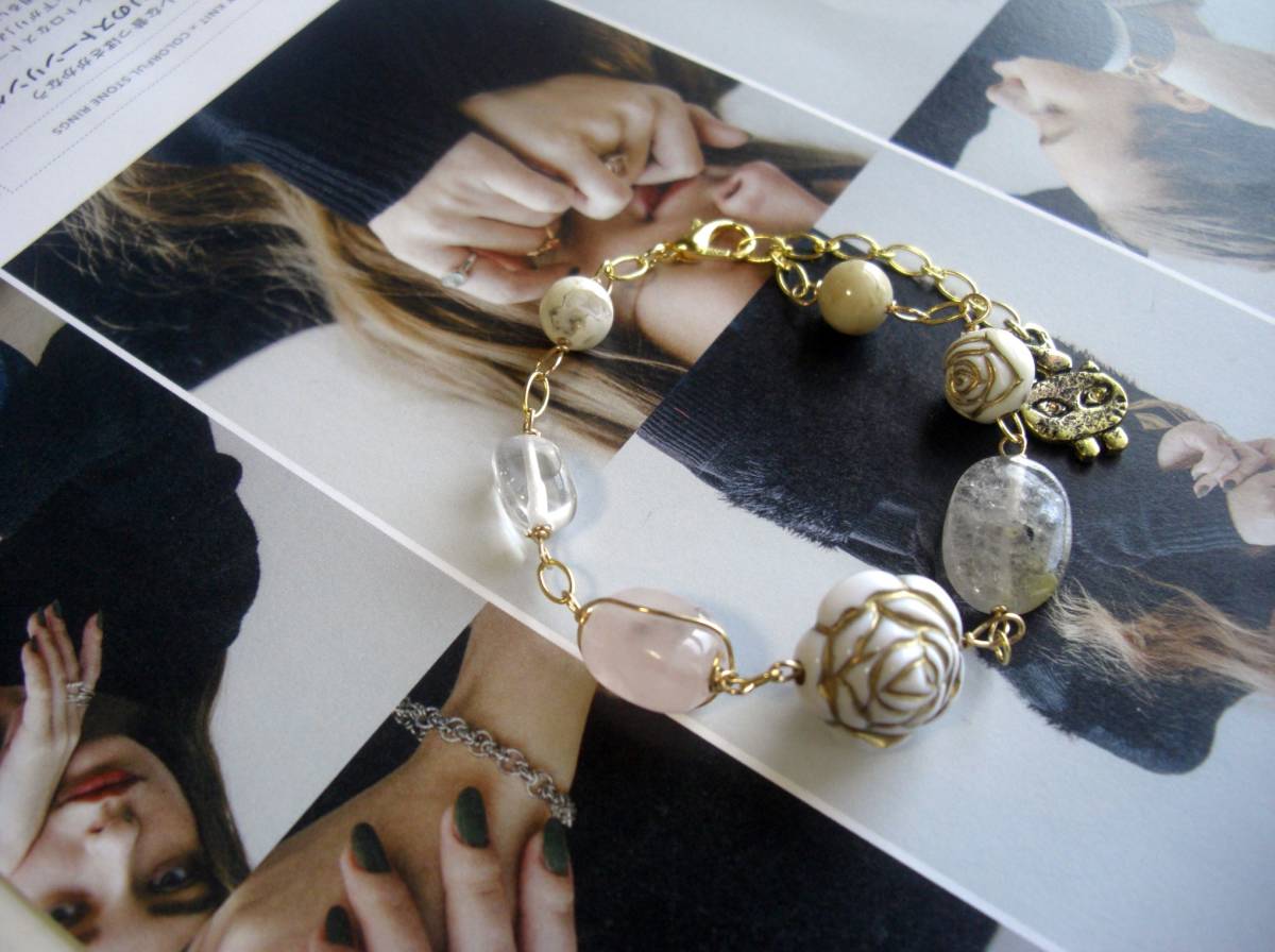 ニューヨーク・テイスト・・シリーズです♪やさしいピンクと薔薇・・可憐なローズクォーツのブレスレットです♪8ミリから18ミリ位までの丸玉、ラフタンブル、オーバルなどのデザイン違い、大きさ違いのローズクォーツ、水晶、アフリカンオパール、ルチルクォーツや樹脂薔薇を合わせてロマンチックな表情です♪所々ワイヤーでデザイ ンしました♪長さは全長23センチ位で 調節自由です♪ネックレスやイヤリングも出品しています♪シンプルで飽きのこないいつまでも着けられるデザインを考 えて作りました!ハンドメイドをご理解頂いてノークレーム、ノーリターンでお願いします