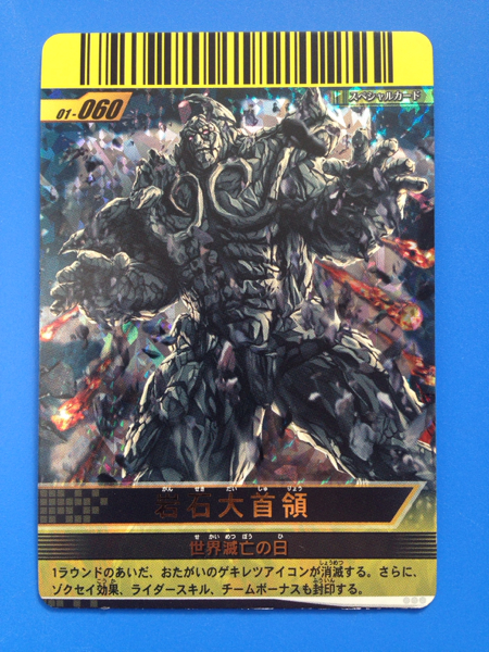 仮面ライダー、ガンバライドの第01弾から、スーパーレア・スペシャルカード、No.060《岩石大首領》の登場です。発送は、普通郵便を利用します。(特にご希望のない場合)おとりまとめも可能ですが、送料に変動する場合がございます。また、送料のご請求は、自宅での計量を基準にご請求させていただいておりますので、実際の金額と差異が出る場合もございます。予めご了承ください。他にも多数出品中です。まとめてこの機会にいかがでしょうか?ご質問お待ちしております。