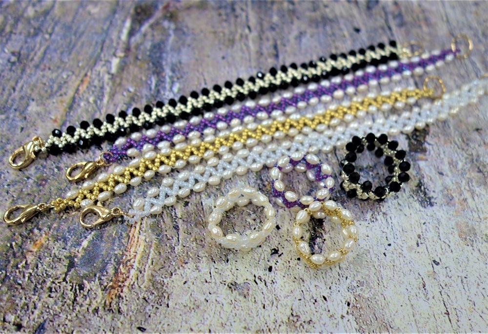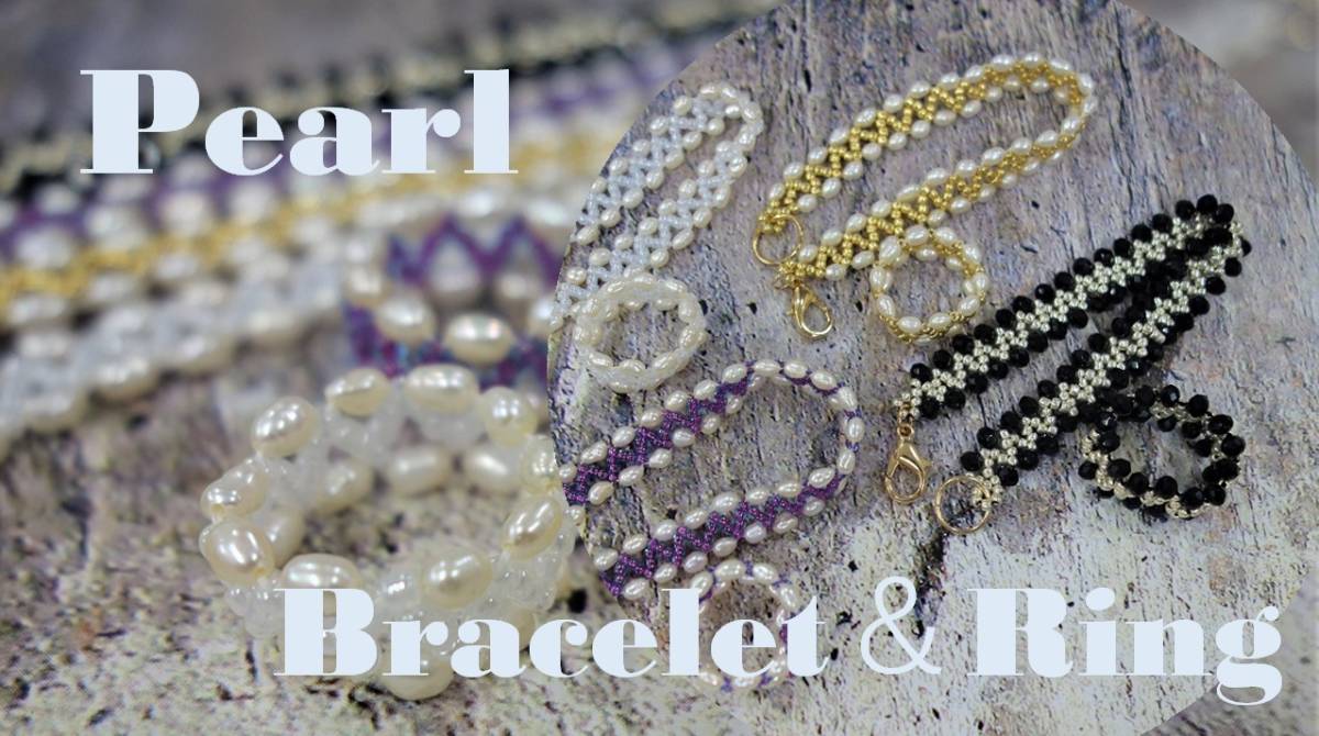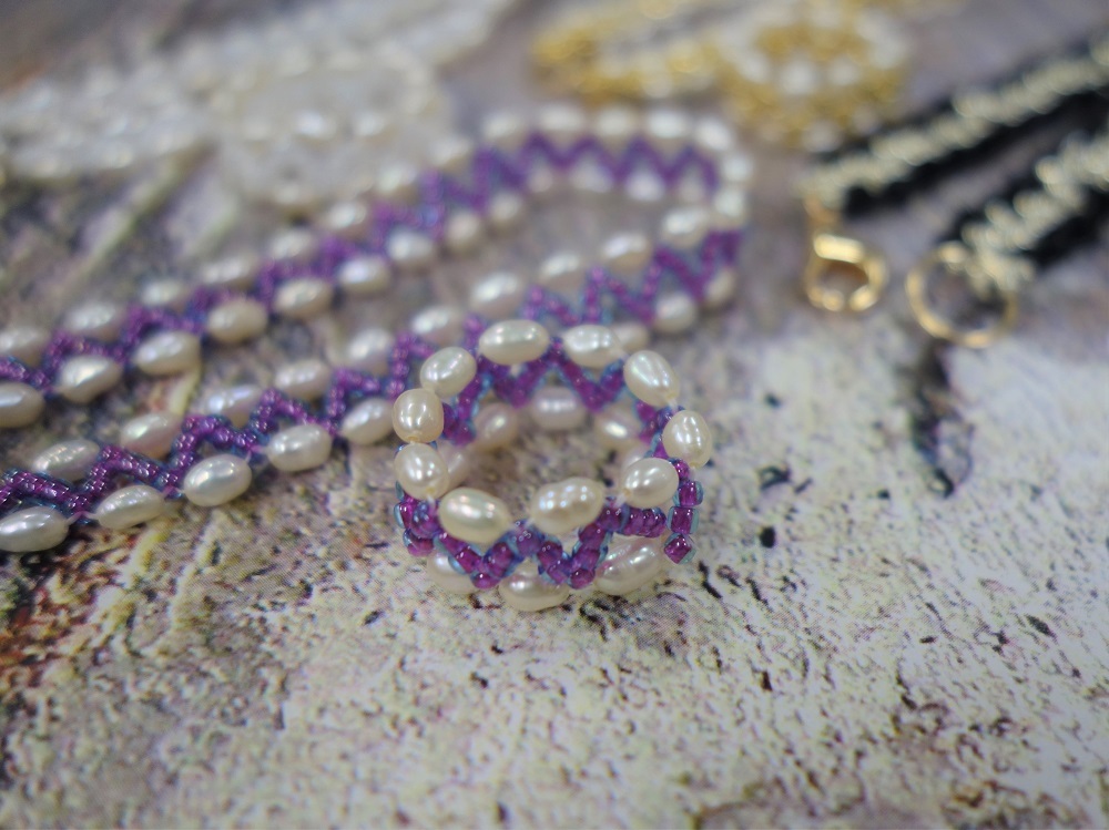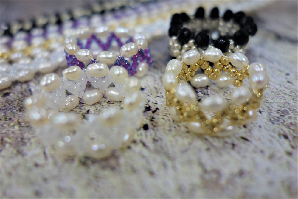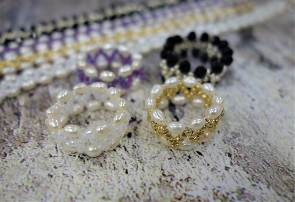 白いビーズ:本物の淡水パール。ブレスレット約50粒使用、指輪約20粒使用。