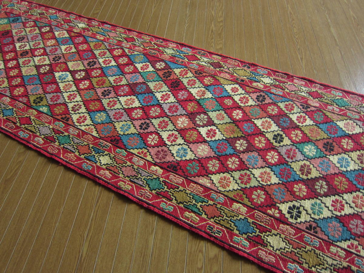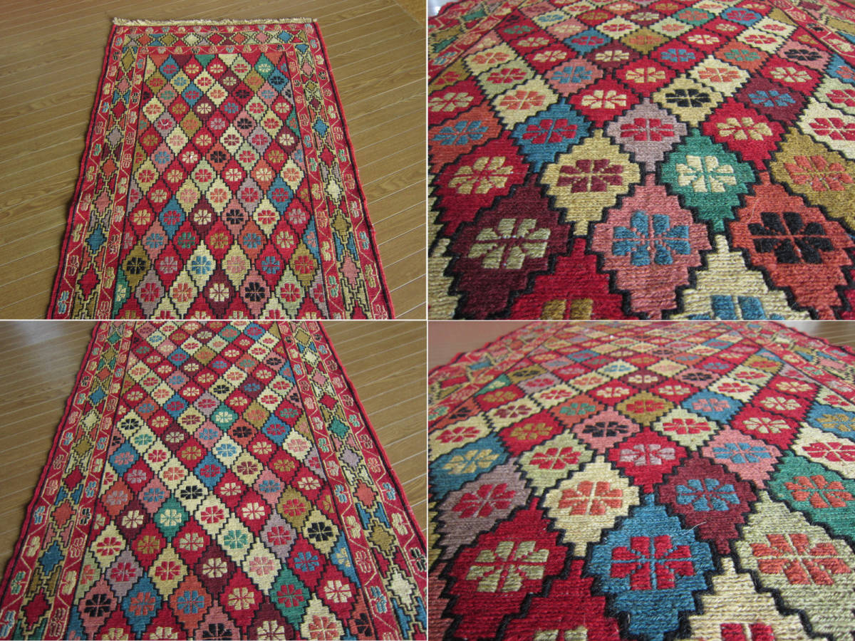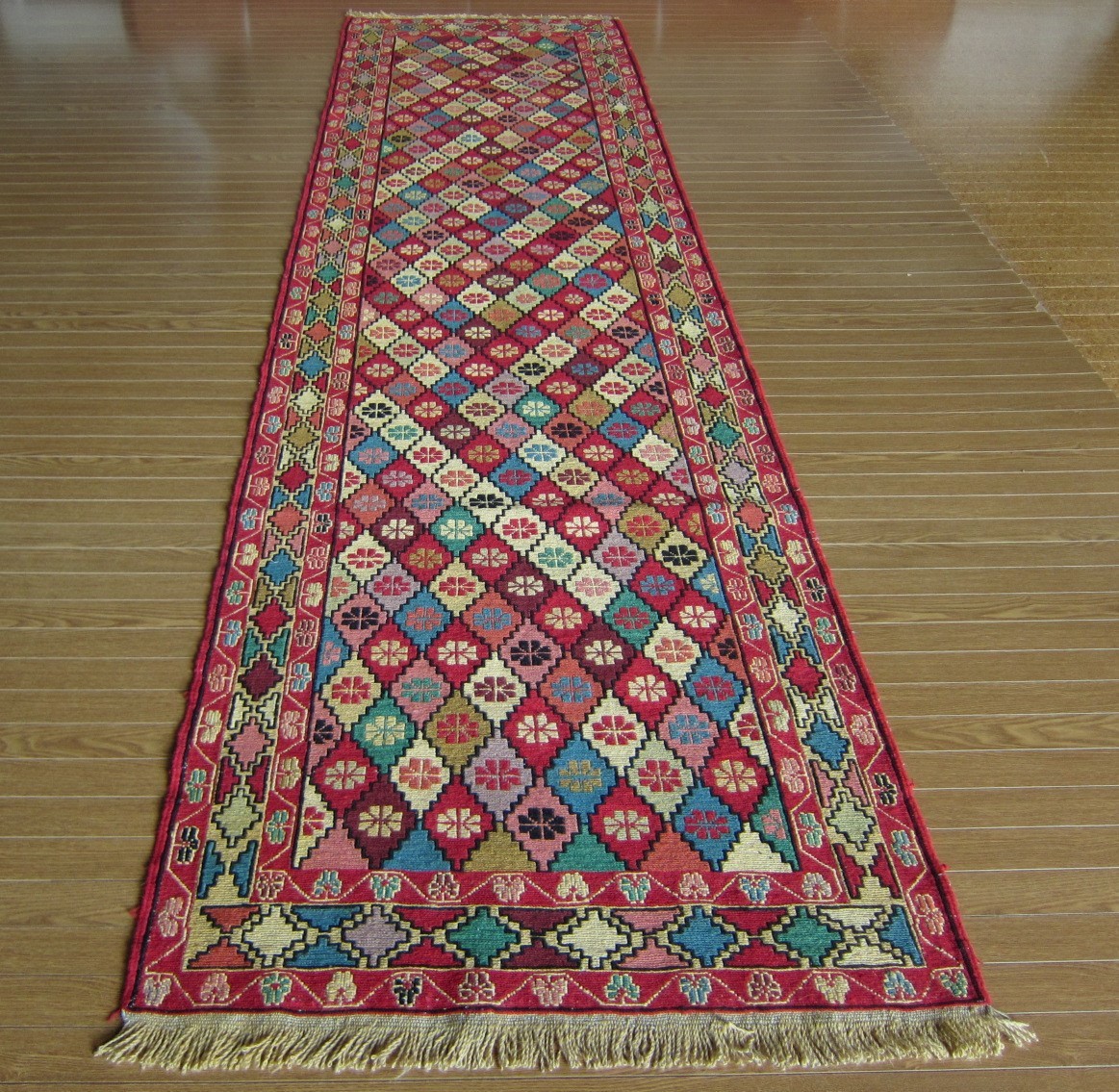 商品説明 | ★素材 : ウール・手織り・スマック織り ※スマック織りとは、イランのキリムの織り方の技法です。 土台の縦糸と横糸の上にもう一本横糸を絡めるように 巻き込んで織っていく高度なテクニックで、 刺繍のように細かな文様を描けることができます。 スマック織りは裏面に模様の糸を渡してあるので 片面使いのキリムになります。 ★サイズ : 約 288×80 cm (房を含まない長さです) ★産地 : イラン・アゼルバイジャン ★状態 : 新品 kxpgs342+ZIBACARPET絨毯 kxpgs342+ZIBACARPET取扱いペルシャ絨毯 FARSHEZIBA_KILIMキリム |