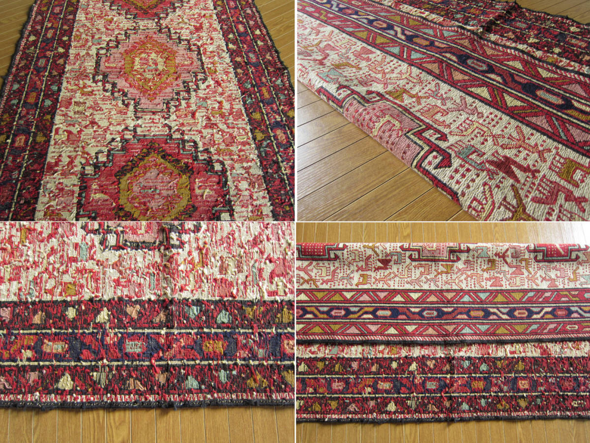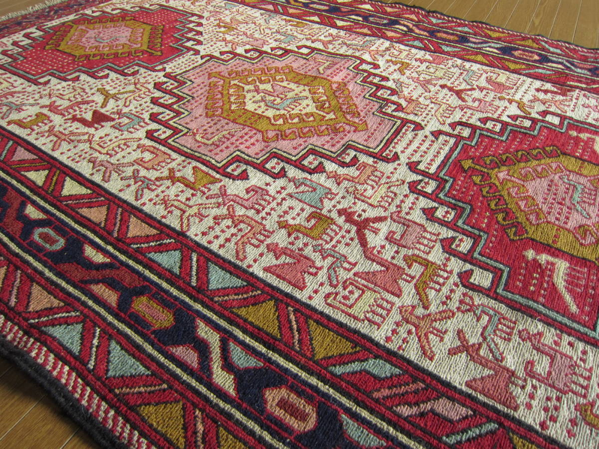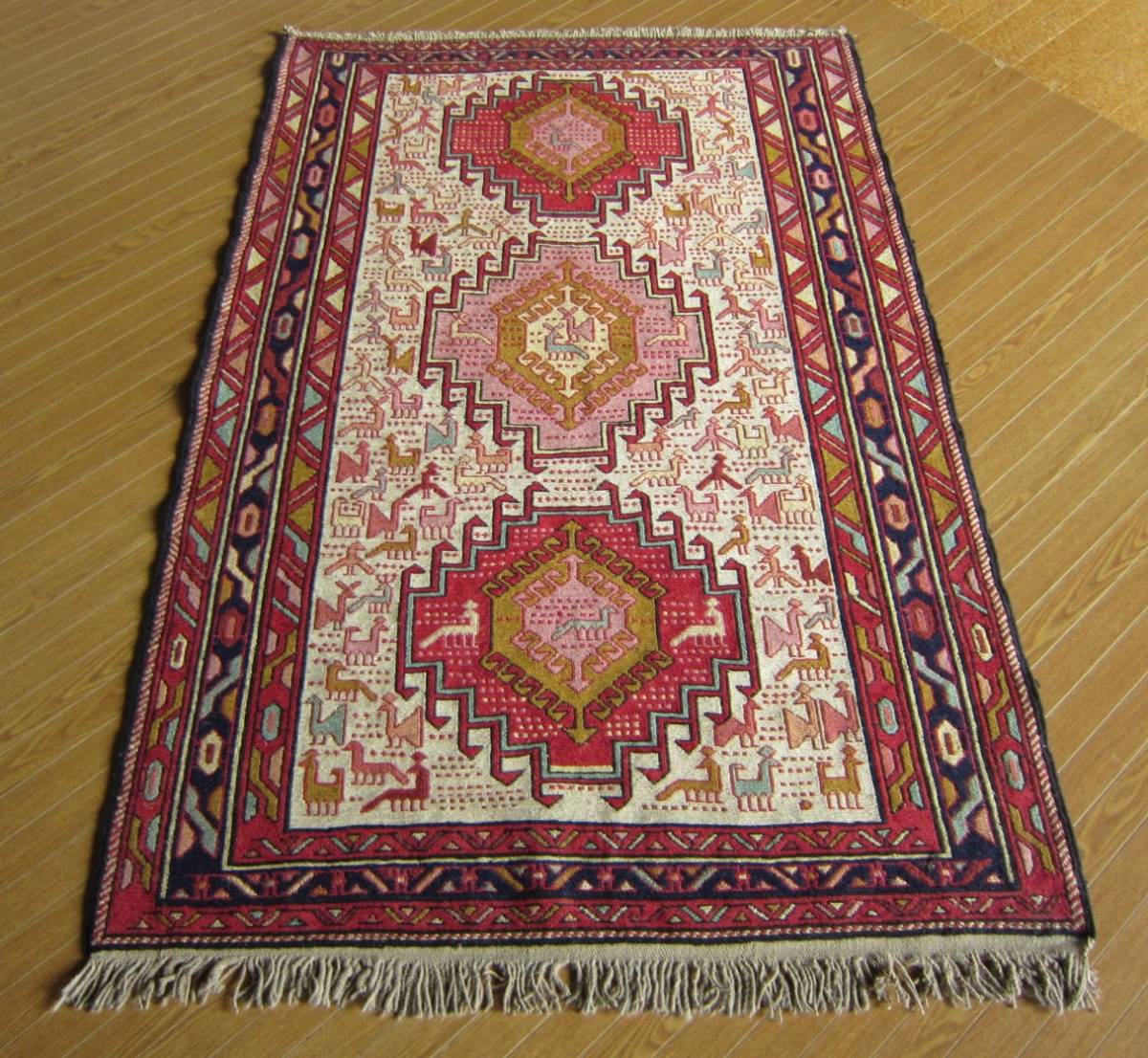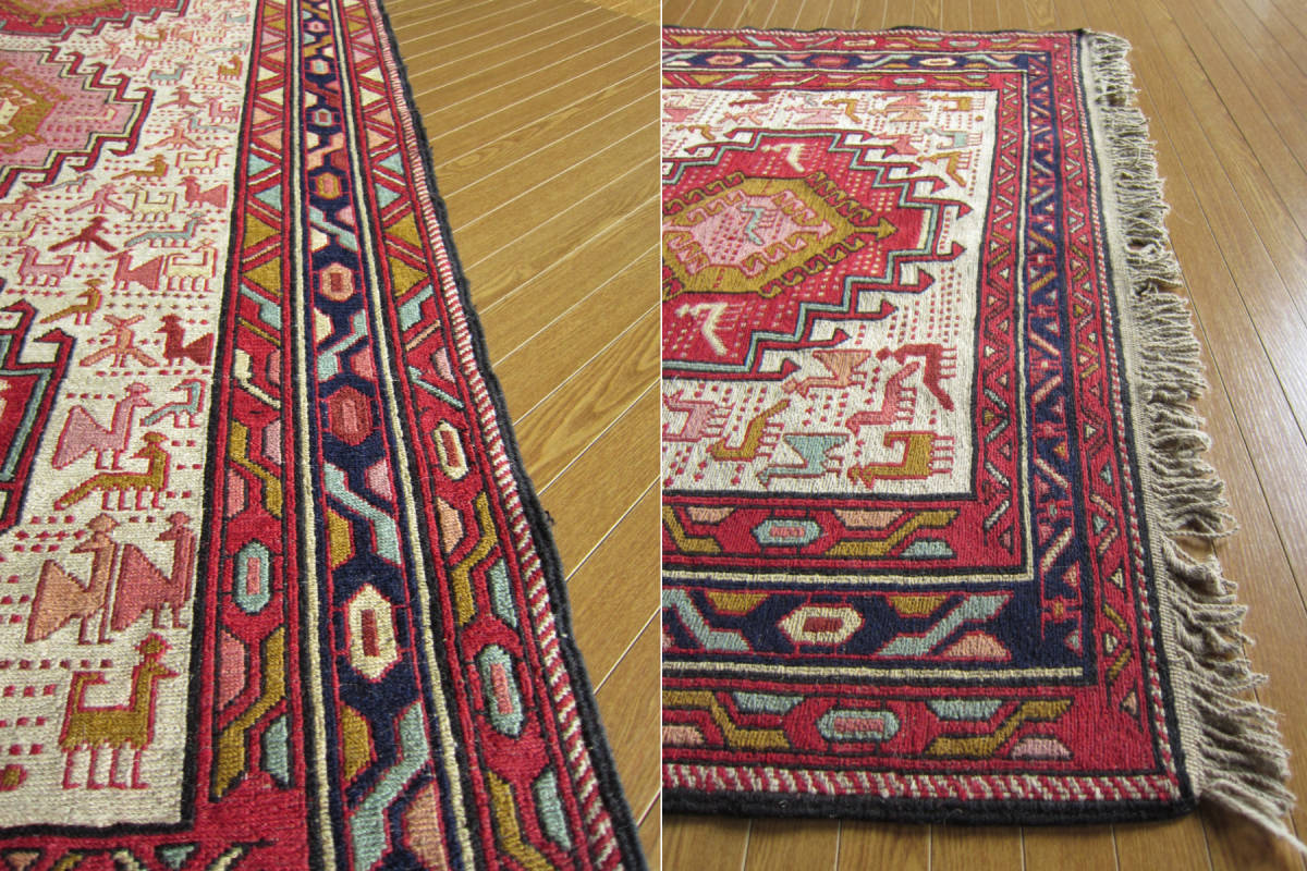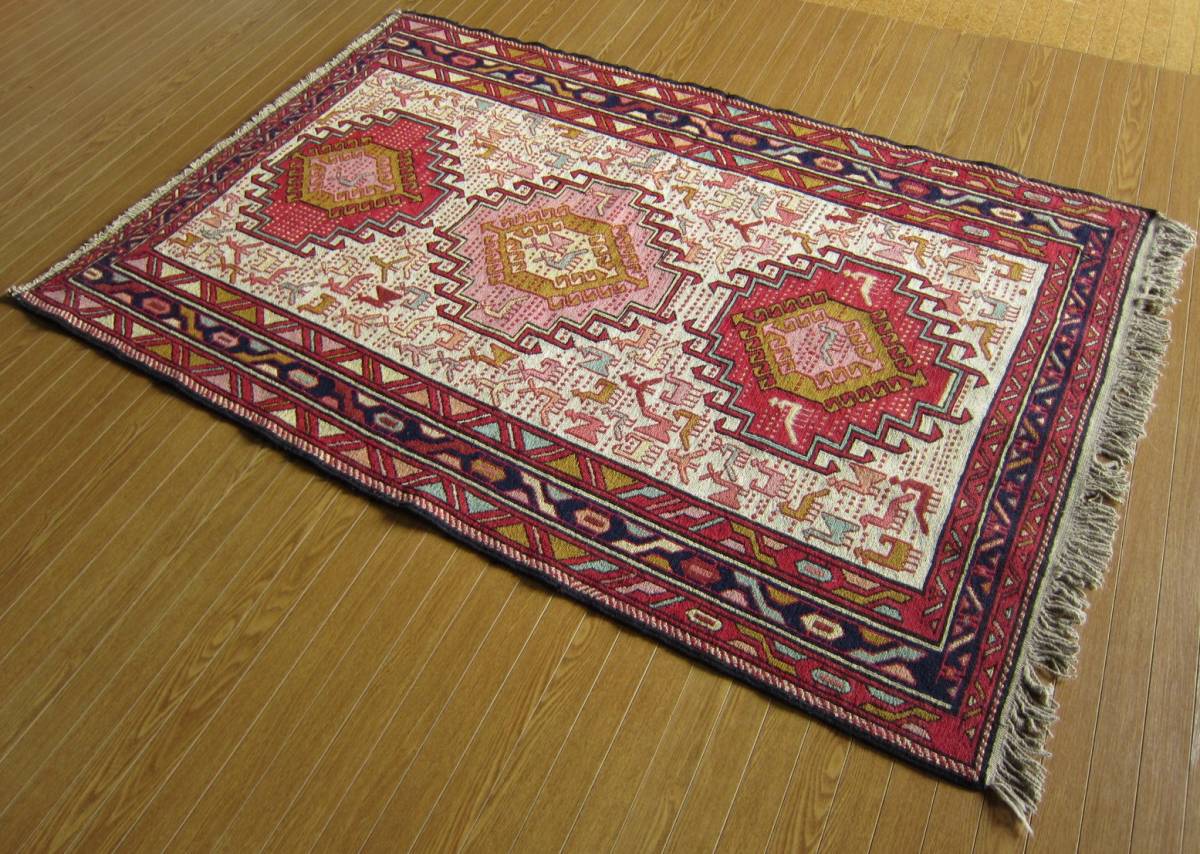 商品説明 | ★素材 : ウール・手織り・スマック織り ※スマック織りとは、イランのキリムの織り方の技法です。 土台の縦糸と横糸の上にもう一本横糸を絡めるように 巻き込んで織っていく高度なテクニックで、 刺繍のように細かな文様を描けることができます。 スマック織りは裏面に模様の糸を渡してあるので 片面使いのキリムになります。 ★サイズ : 約 165×111 cm (房を含まない長さです) ★産地 : イラン・アゼルバイジャン ★状態 : 新品 kxpgs342+ZIBACARPET絨毯 kxpgs342+ZIBACARPET取扱いペルシャ絨毯 FARSHEZIBA_KILIMキリム |