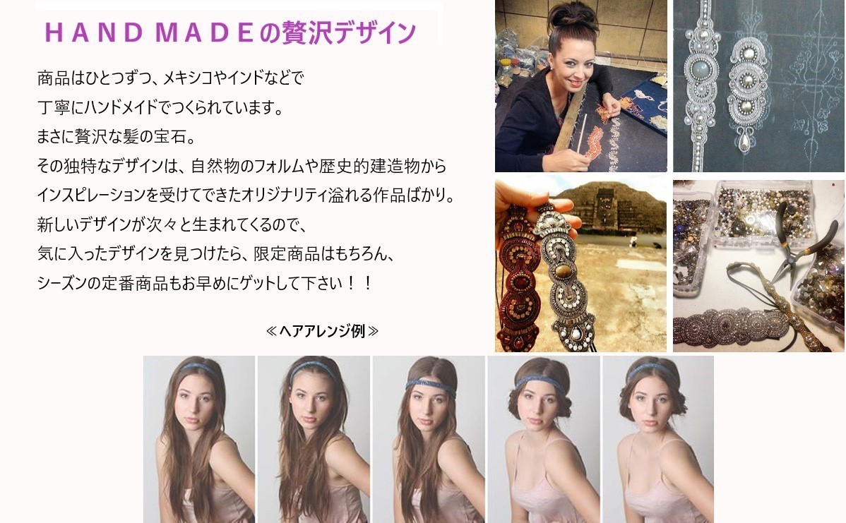 ヘアジュエリーがいよいよ日本に上陸!!ゴージャスで繊細な手作りヘアアクセサリーで簡単、手軽にヘアアレンジにチャレンジ。カチューシャのように使ったり、アップした髪のフロントやサイドのワンポイント使いなどもお洒落。帽子に付けたり、重ねづけしたりアレンジは自由自在!ぜひ自分流のヘアアレンジを試して楽しんで下さい。