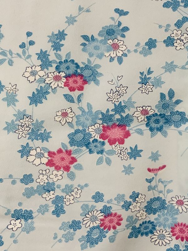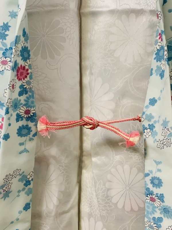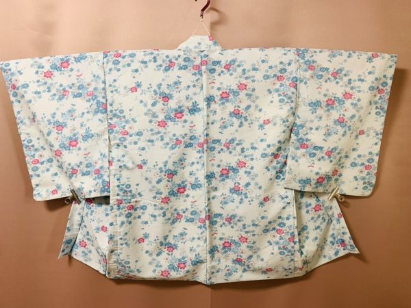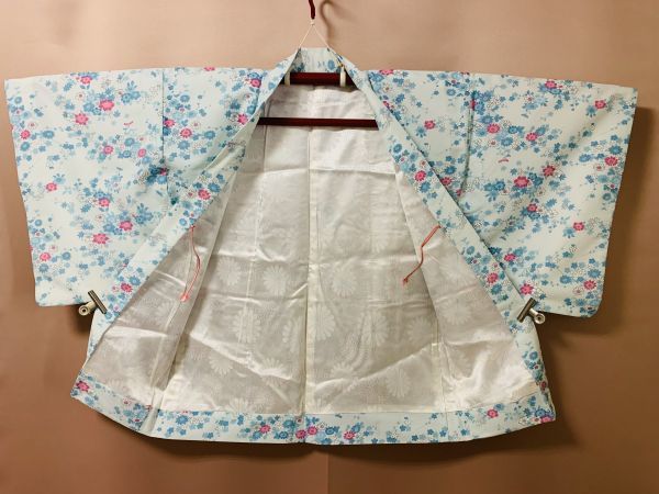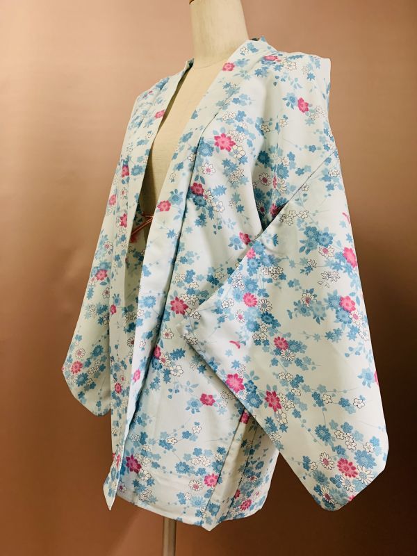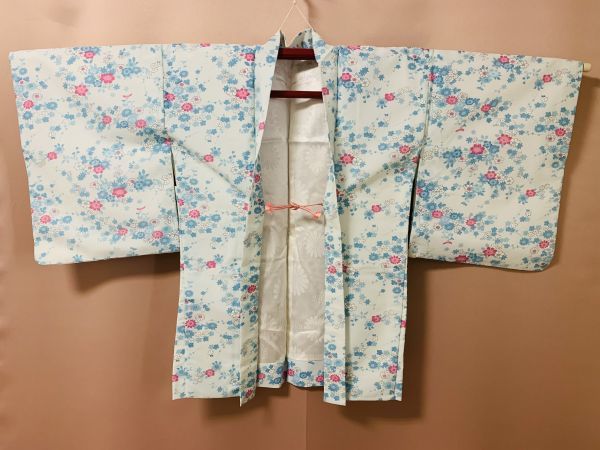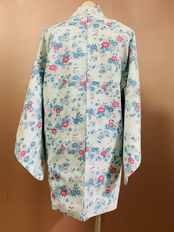 美品 婦人用 着物 袷の羽織 化繊 白藍色に花紋様 お出かけに コスプレにも 保管品