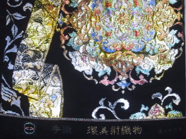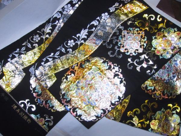 写真2でわかりますように西陣の高級品メーカーのお品です。手織り。6通がら本袋帯 絹100%金属糸等使用  新品み仕立て品。振袖、訪問着用の黒地帯です。 『慶賀鏡裏文』長く縦に伸びた熨斗目はきいろみをおびた金~プラチナ色。華文もきいろみをおびた金~プラチナ色濃淡があります。