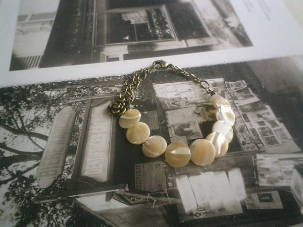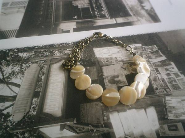 イノセントなパターン・・シリーズです♪幸せの予感・・シックなマザーオブパールのブレスレットです♪やさしいベージュ色のマザーオブパールは12ミリ位のコインです♪アンティークチェーンを合わせてクラシカル・モダンな表情です♪長さは全長22センチ位で調節自由です♪♪お揃いのブレスレットやネックレスやピアスも出品しています♪♪シンプルで飽きのこないいつまでも着けられるデザインを考えて作りました!ハンドメイドをご理解頂いてノークレーム、ノーリターンでお願いします
