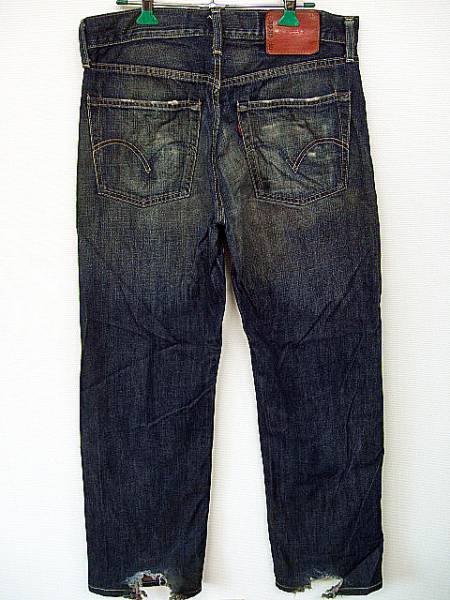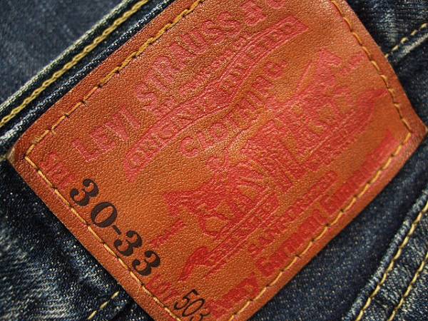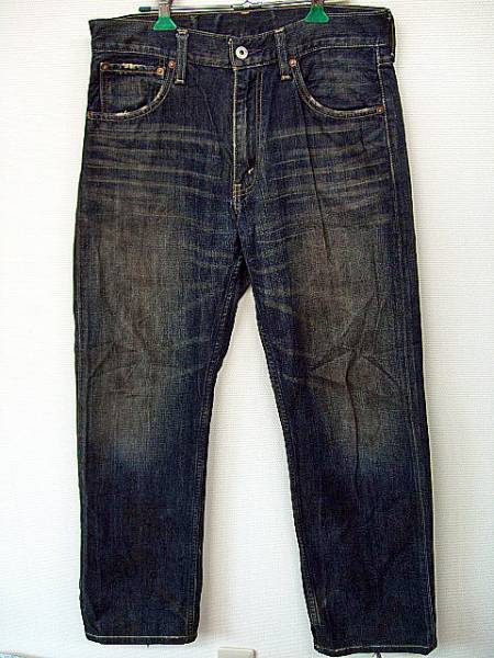 Levi's 503-03です。画像のように、黒っぽいインディゴブルーに激ヒゲ・滝のような縦落ちがたまりません!!表面が凸凹した上質のデニムですので、これからの色落ちも楽しみな一本です。◆表記サイズ…30-33 実寸サイズ…ウエスト約79cm 股下約76cm 腿幅約30cm 裾幅約21cm◆USEDです。裾先にダメージが有りますが他濃紺で状態良好です。◆