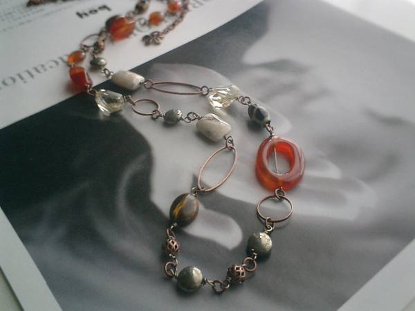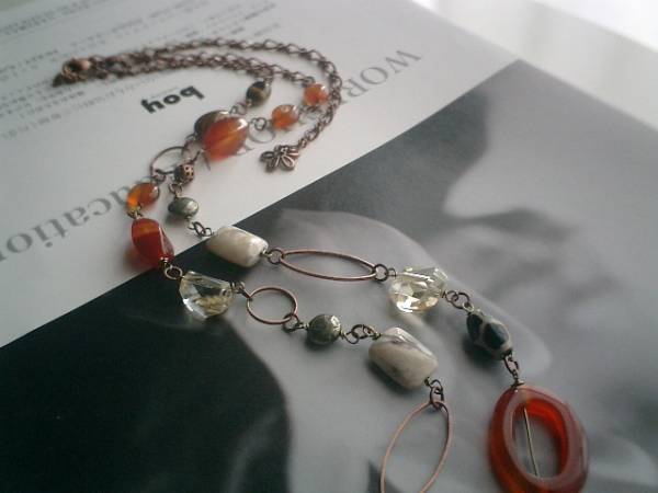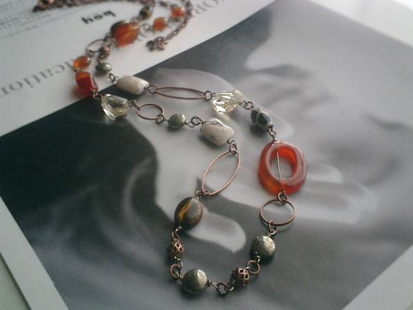 カワイイと可愛いの間に・・シリーズです♪ベーシックに遊んで・・シックなカーネリアンのネックレスです♪レモン水晶やタイガーアイやパイライトや天珠など個性的な素材を集めてオリエンタルモダンなデザインです♪カーネリアンは8ミリのコインや18ミリのツイストナツメ、25×18ミリのオーバルリングです♪8ミリのコインのパイライトや12ミリから15ミリ位までのレモン水晶や天珠やオーバルのタイガーアイやジャスパーなど合わせました♪長さは全長86センチ位で調節自由です♪2連にされても素敵です♪同じデザインの長さ違いのネックレスやお揃いのブレスレットも出品しています♪♪シンプルで飽きのこないいつまでも着けられるデザインを考えて作りました!ハンドメイドをご理解頂いてノークレーム、ノーリターンでお願いします