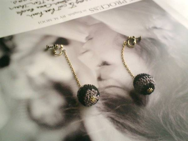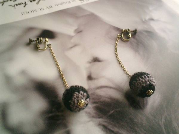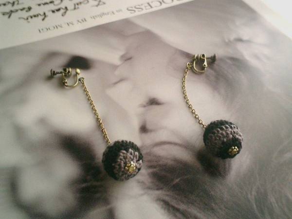シック・パンクシリーズです♪シックな編みボールのキュートなイヤリングです♪♪15ミリのブラックとパープルの編みボールはキュートモダンな表情です♪長さは8・5センチ位です♪♪ピアスにも変更出来ます♪お揃いのネックレスも出品しています♪シンプルで長く着けていただけるデザインを考えて作りました♪ハンドメイドをご理解頂いてノークレーム、ノーリターンでお願いします