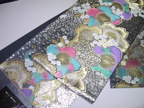 京都西陣 じゅらく の 若向きよう(振袖、訪問着、付け下げ、無地、小紋、など向き)のTOPブランド品『花かるた(花かおり)』ブランドです。6通柄袋帯 新品未仕立て品、絹100%金属糸等使用  濃紺色地に銀色のの生地に さくらはな、、、