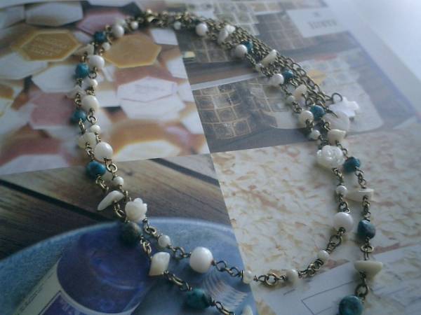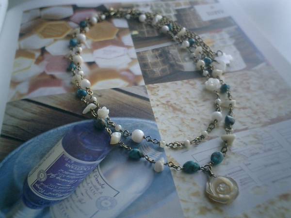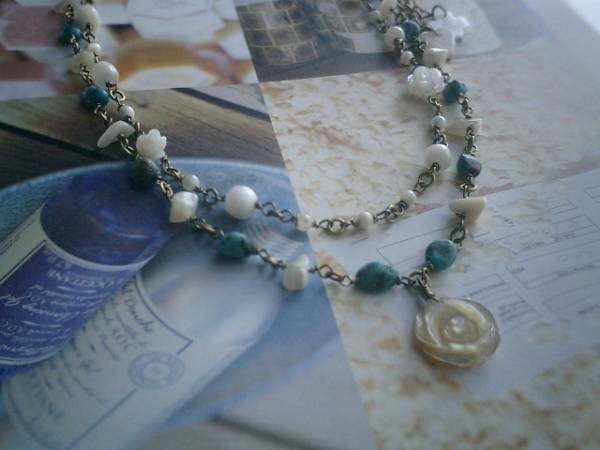 愛しいお気に入り・・シリーズです♪初夏の訪れ・・シックなターコイズとマザーオブパールの薔薇のネックレス2本セットです♪♪ターコイズにはマザーオブパールのさざれをはさんで爽やかな表情です。トップのシェル薔薇は15ミリ位です♪長さは全長50センチ位で調節自由です♪チョーカー風につけられても素敵です♪3ミリと6ミリ位の丸玉、10ミリ、12ミリの大きさ違いの薔薇のマザーオブパールのネックレスはオフホワイトでまとめて可憐な表情です♪長さは全長53センチ位で調節自由です♪どちらも単品でも出品しています♪お揃いのブレスレットも出品しています♪シンプルで飽きのこないいつまでも着けられるデザインを考えて作りました!ハンドメイドをご理解頂いてノークレーム、ノーリターンでお願いします