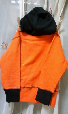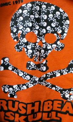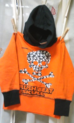 ・新品タグ付・サイズ100/平置丈約38身幅約32・綿100/裏毛なしスエット・オレンジ×ブラック◆ドクロプリントの中にも小さなドクロプリント♪綺麗な鮮やかオレンジも目立つ格好いいフード付トレーナーパーカー◆定形外250gまで