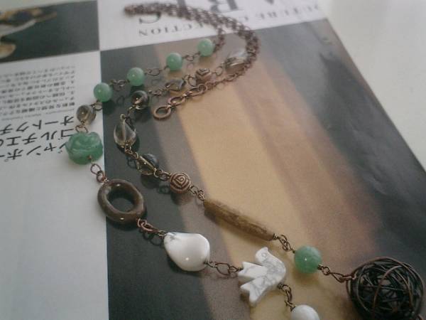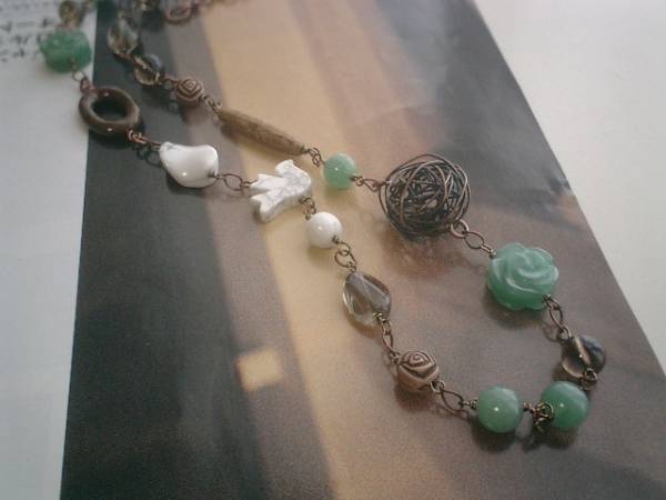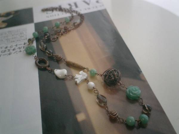 後ろボタンのワンピース・・シリーズです♪白い小鳥さんと薔薇のネックレスです♪グリーンアベンチュリンの薔薇とホワイトハウライトの小鳥さんが可憐な表情です♪8ミリの丸玉、14ミリの両面薔薇のグリーンアベンチュリンにスクエア、フラットオーバル、8ミリの丸玉のスモーキークォーツや8ミリのランダムカット、小鳥さん、ツイストオーバルのホワイトハウライト、薔薇のウッド、ワイヤー玉など個性的な素材を合わせてキュートモダンしています♪長さは全長98センチ位で調節自由です♪2連にされても素敵です♪お揃いのネックレスやブレスレットやイヤリングも出品しています♪シンプルで飽きのこないいつまでも着けられるデザインを考えて作りました!ハンドメイドをご理解頂いてノークレーム、ノーリターンでお願いします