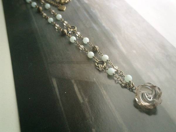 秋の美術館・・シリーズです♪ジュリエットの薔薇・・儚げなスモーキークォーツの薔薇が大人のロマンチックしています♪淡いお色のアマゾナイトの6ミリの丸玉とスモーキークォーツの4ミリの丸玉にジルコニアリングや透かしメタルビーズを合わせました♪トップの薔薇は20ミリ位です♪♪長さは全長77センチ位で調節自由です♪♪お揃いのブレスレットも出品しています♪シンプルで飽きのこないいつまでも着けられるデザインを考えて作りました♪ハンドメイドをご理解頂いてノークレーム、ノーリターンでお願いします