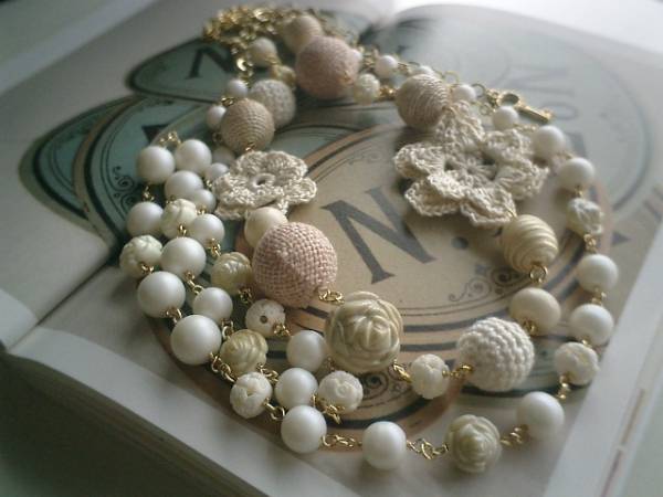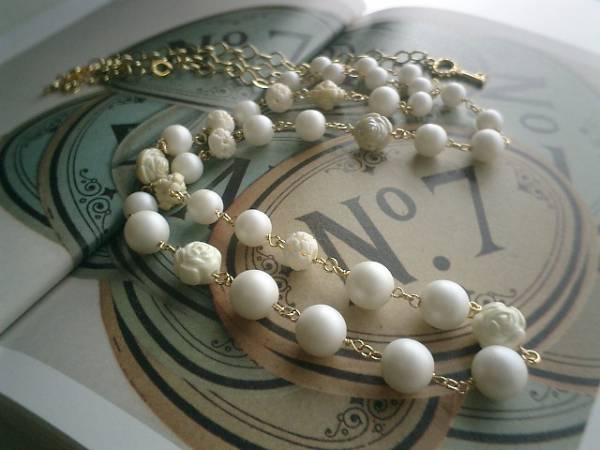 女の子チック・・シリーズです♪マットなホワイト・ベージュのネックレス2点セットです♪色々な組み合わせで楽しんでいただけます♪どちらもホワイト・ベージュ色でまとめてふんわりやさしい表情です♪32ミリから48ミリ位の大きさ違いデザイン違いの編みフラワーには8ミリから20ミリ位までの樹脂薔薇や編みボールや麻ボールや透かしボーンを合わせて大人のロマンチックしています♪長さは全長66センチ位で調節自由です♪長い方のネックレスはマットな樹脂パールの8ミリ、10ミリ、12ミリの丸玉に樹脂薔薇や透かしボーンを合わせました♪長さは全長106センチ位で調節自由です♪2連にされても可愛いです♪マットなオフホワイトがアンティークな表情です♪それぞれ単品でも出品しています♪♪お揃いのブレスレットも出品しています♪シンプルで飽きのこないいつまでも着けられるデザインを考えて作りました!ハンドメイドをご理解頂いてノークレーム、ノーリターンでお願いします