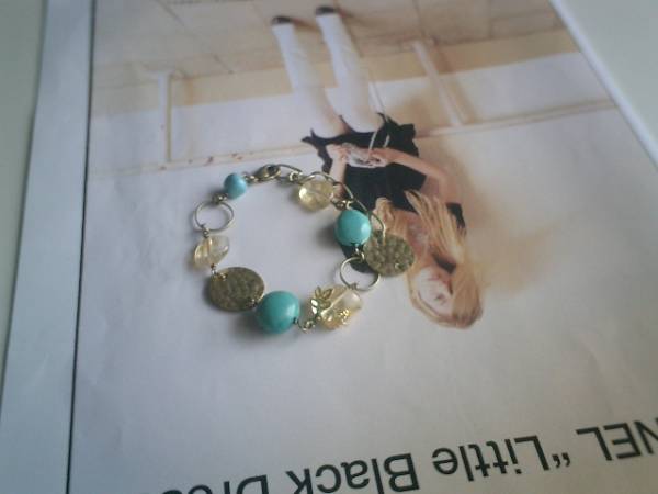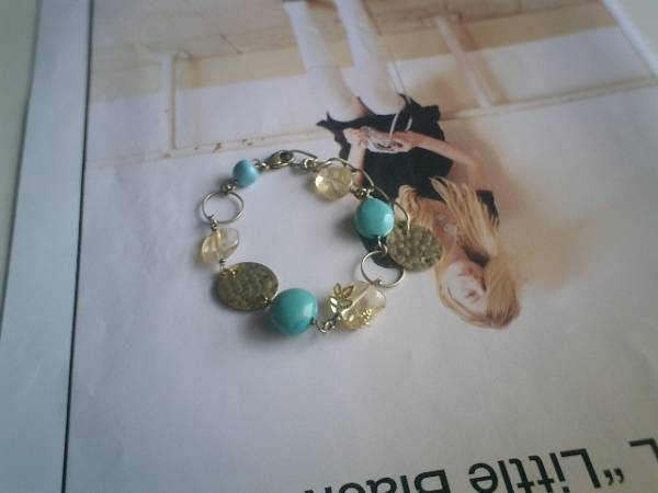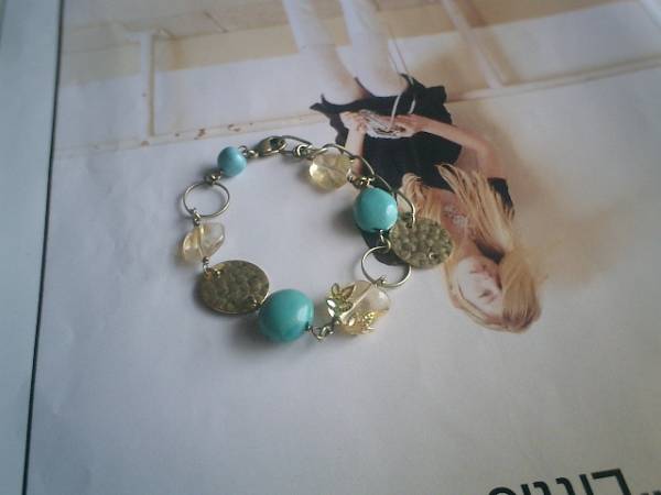 女の子的ディテール・・シリーズです♪初夏のターコイズ・・爽やかなターコイズのブレスレットです♪6ミリから12ミリ位までのタンブルのターコイズに繊細なシトリンやイタリアンメタルを合わせてフレンチ・カジュアルな表情です♪長さは全長23センチ位で調節自由です♪♪お揃いのネックレスも出品しています♪♪ハンドメイドをご理解いただいてノークレーム・ノーリターンでお願いします♪