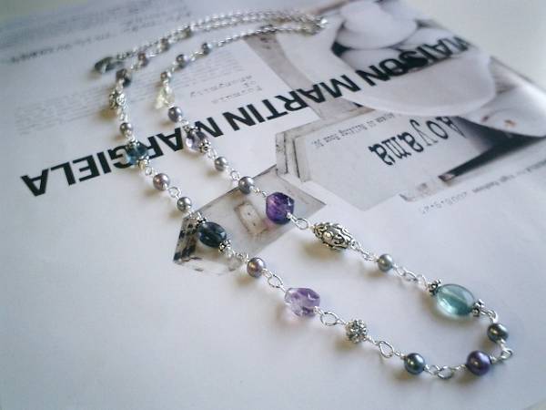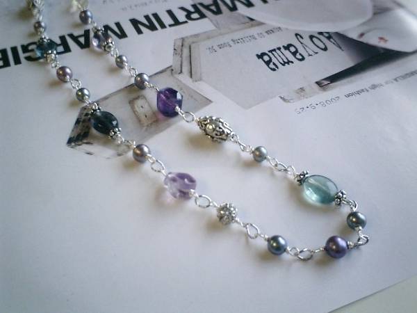 時の隙間シリーズです♪過去と未来の夢を探して・・♪天使の贈り物(?)シックなパープルグレーの淡水パールと繊細なクォーツのネックレスです♪ひっそり華やかにロマンチックな表情です♪パープルグレーの淡水パールは5ミリと6ミリ位のポテトです♪ラフカットのアメジストやスモーキークォーツやレモン水晶や座金でおめかししたフローライトやデザインメタルチャームを合わせてロマンチックにまとめました♪♪パリ(??)っぽいアンティークな雰囲気で作りました。長さは全長76センチ位で調節自由です♪2連にしてチョーカー風に着けても可愛いです♪セットのネックレスやお揃いのブレスレットも出品しています♪シンプルで飽きのこないいつまでも着けられるデザインを考えて作りました!ハンドメイドをご理解頂いてノークレーム、ノーリターンでお願いします