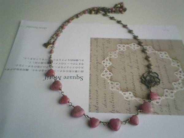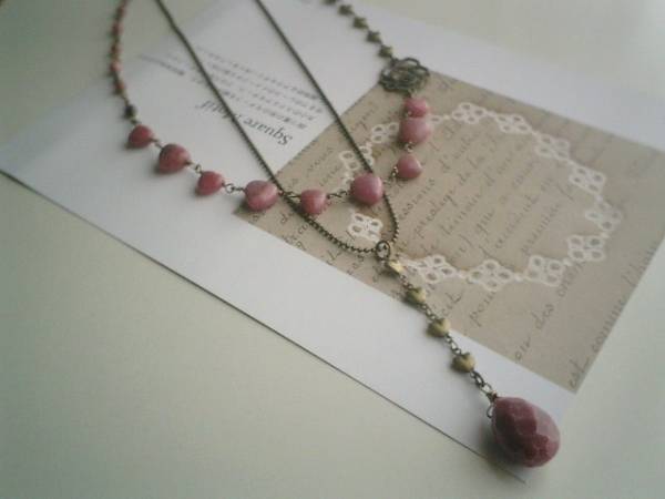 エキセントリック少女・・シリーズです♪薔薇色に恋して・・キュートなロードナイトのネックレス2本セットです♪4ミリの丸玉や8ミリ、10ミリのハートのロードナイトには薔薇の透かしチャームやハートのチェーンを合わせて大人のロマンチックしています♪長さは全長76センチ位で調節自由です♪2連にされても可愛いです♪18×13ミリのドロップカットのロードナイトにはハートのデザインチェーンやボールチェーンを合わせてアンティークモダンな表情です♪長さは72センチ+アジャスター10センチで最長82センチ位です♪トップはチェーンを合わせて7センチ位です♪それぞれ単品でも出品しています♪お揃いのブレスレットやピアスも出品しています♪シンプルで長く着けていただけるデザインを考えて作りました♪ハンドメイドをご理解頂いてノークレーム、ノーリターンでお願いします