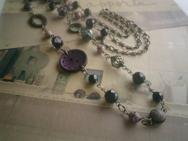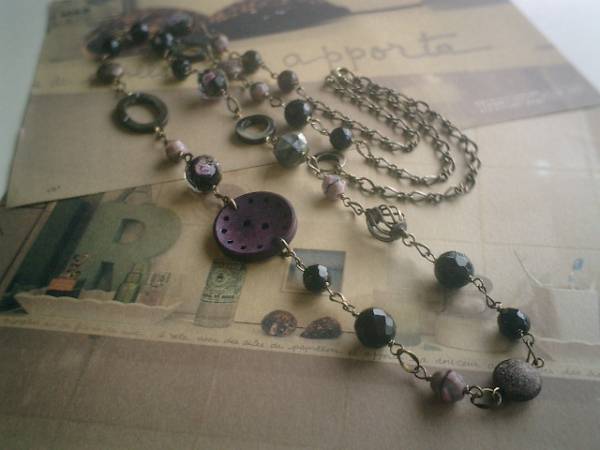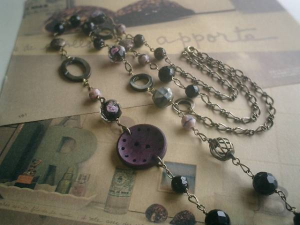 ノスタルジックに染まって・シリーズです♪オニキスと薔薇のネックレスです♪8ミリ、10ミリのランダムカットのオニキスに薔薇模様のベネチアビーズやモーヴピンクのチェコビーズやダークパープルのデザインウッドやグレーやパープルのモダンビーズやグレーシェルのリングを合わせてオリエンタルにロマンチックしています♪長さは全長105センチ位で調節自由です♪2連にされても素敵です♪♪お揃いのブレスレットも出品しています♪シンプルで飽きのこないいつまでも着けられるデザインを考えて作りました!ハンドメイドをご理解頂いてノークレーム、ノーリターンでお願いします |