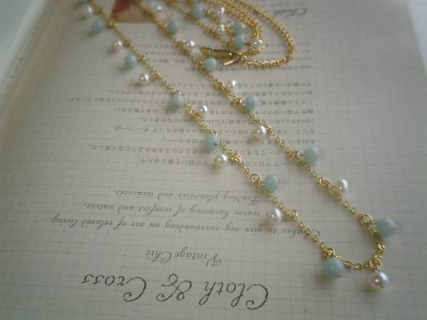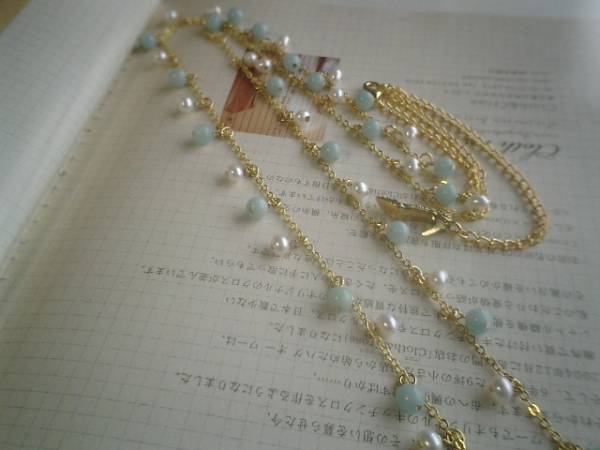 女の子テイスト・・シリーズです♪春色のアマゾナイトと淡水パールのネックレスです♪シックなブルーグレーのアマゾナイトとオフホワイトの淡水パールがふんわりやさしい表情です♪6ミリの丸玉のアマゾナイトと5ミリ位のポテトの淡水パールをランダムに繋いでいます♪長さは84センチ+アジャスター16センチで全長100センチ位です♪そのまま長くされても2連にされても素敵です♪♪お揃いのブレスレットやイヤリングも出品しています♪シンプルで飽きのこないいつまでも着けられるデザインを考えて作りました!ハンドメイドをご理解頂いてノークレーム、ノーリターンでお願いします