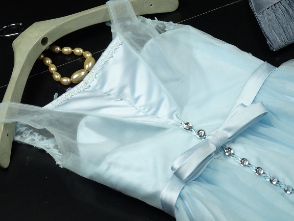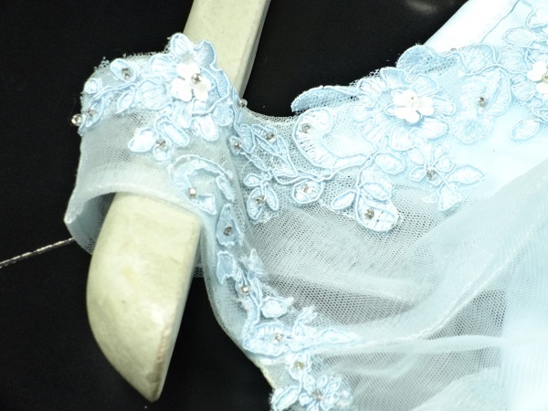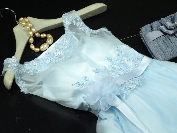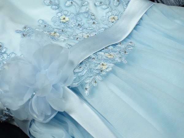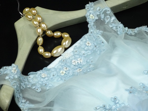 トップス部分立体花柄刺繍チュールパ-ティ-ドレスです。トップスに水色糸の立体刺繍が施されたレースが重ねられとても豪華です。全体的にサテン地の上に無地のチュールをたっぷりと重ね豪華な雰囲気に。パーティやイベント、結婚式など、様々なシーンで、気品のある印象を与えてくれる一枚です。背中ボタン有。胸パット付。